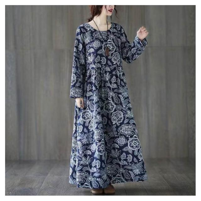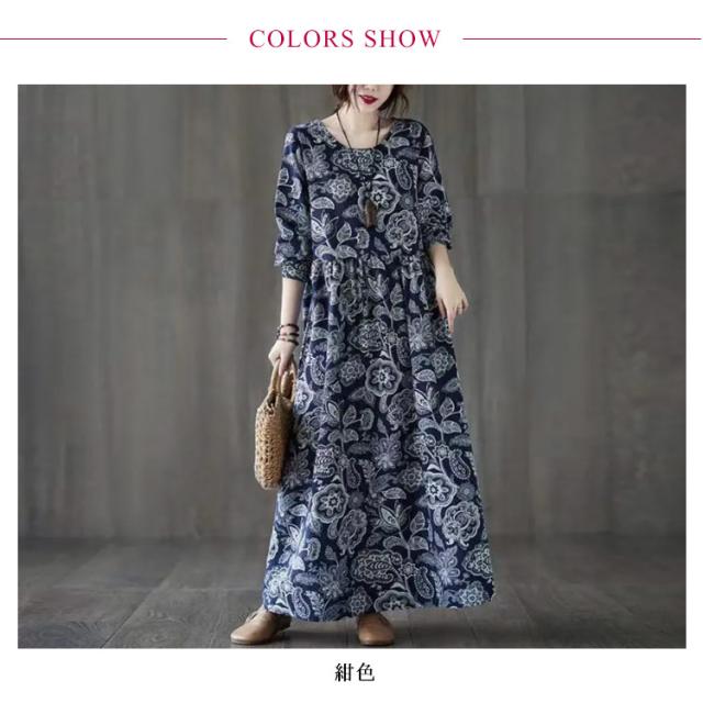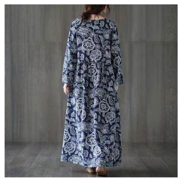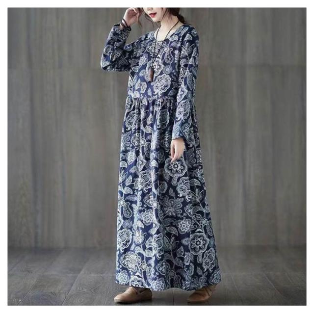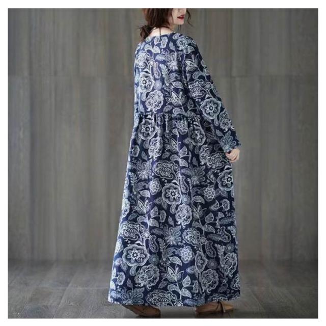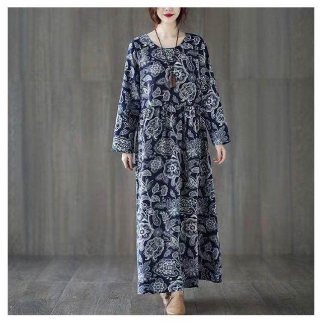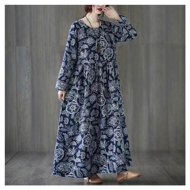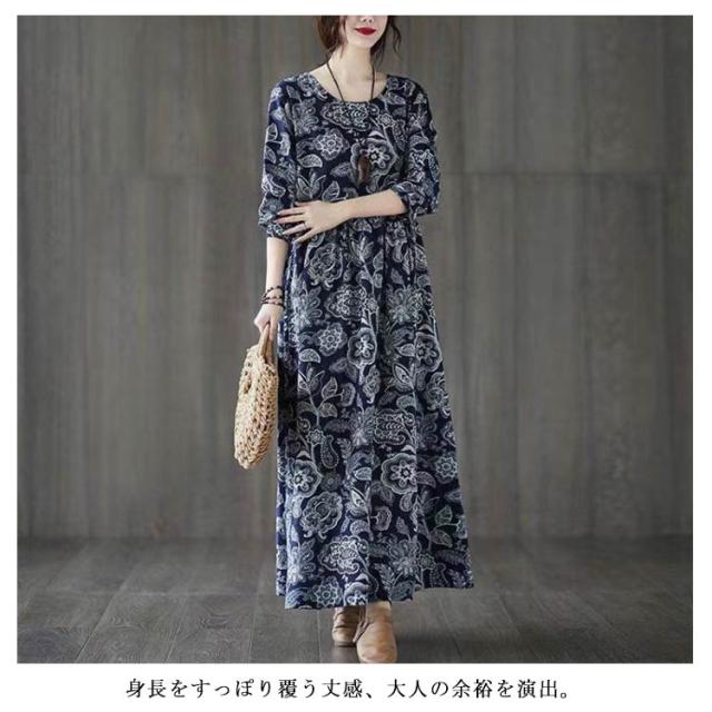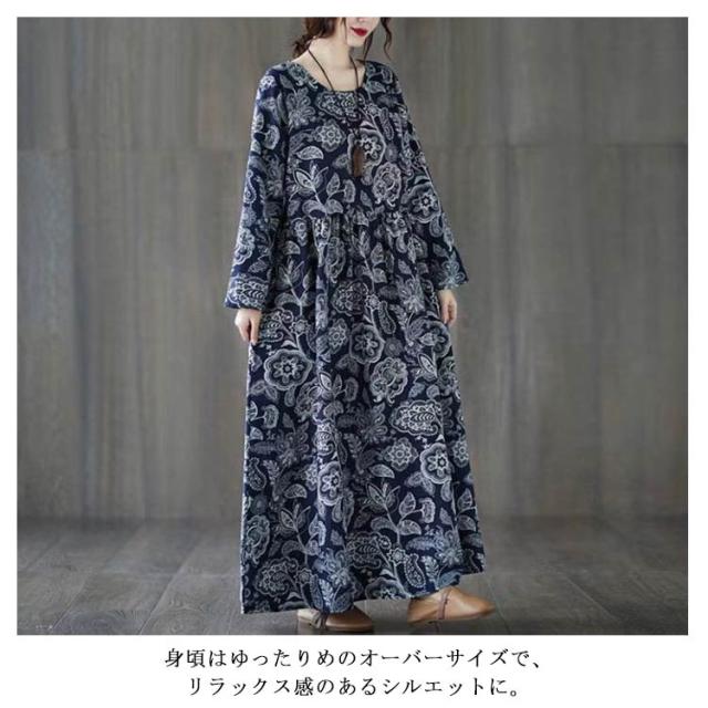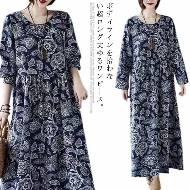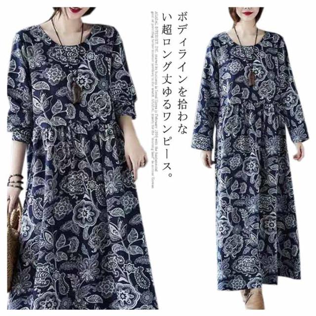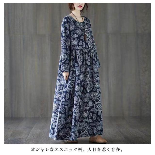 送料無料 マキシワンピース 超ロング丈 長袖 ワンピース エスニック柄 レディース フレア Aライン ゆったり 体型カバー 40代 30代40代