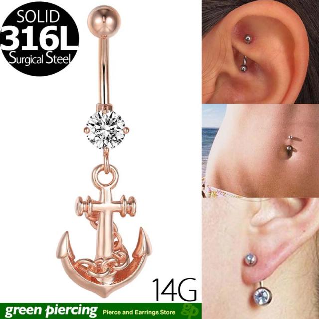 [14G カーブバーベル ボディピアス]ピンクゴールドマリンアンカー チャーム へそピアス 14ゲージ ヘソピアス 臍ピアス メンズ レディース ボディーピアス サージカルステンレス316L ジルコニア クリスタル 揺れる パベ ジュエル 石付き キラキラ ストーン 爪 ツメ バーチカル
