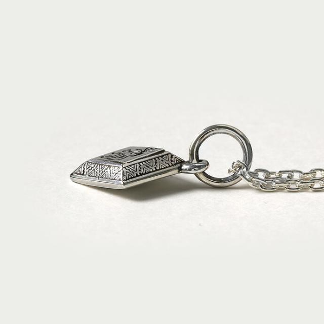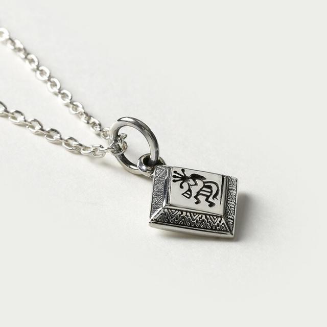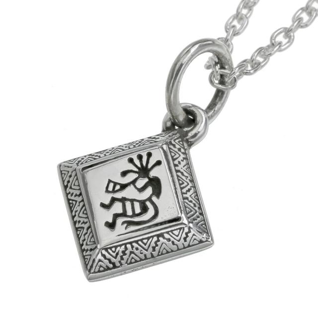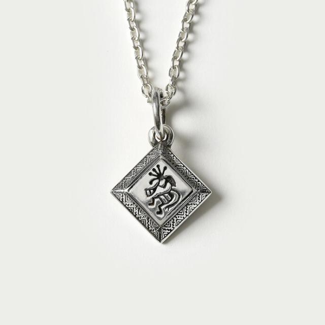 ココペリを中心にデザインした、ひし形のペンダント。笛を吹くことで豊穣や幸運をもたらすと言われた精霊・ココペリは、ラッキーモチーフとしてインディアンジュエリーの中でも人気のモチーフです。台形になっているペンダントの側面には幾何学模様が刻印されており、ココペリと合わせて程よいネイティブ感が演出できるアイテムです。
