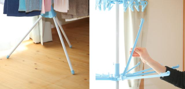 | 場所を取らない3本脚 省スペースに配置できる3本脚で洗濯物をしっかりと支えます。 | 折りたたみ簡単 タオルハンガーは上に向かって簡単に折り畳みできます。 |