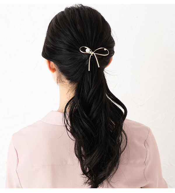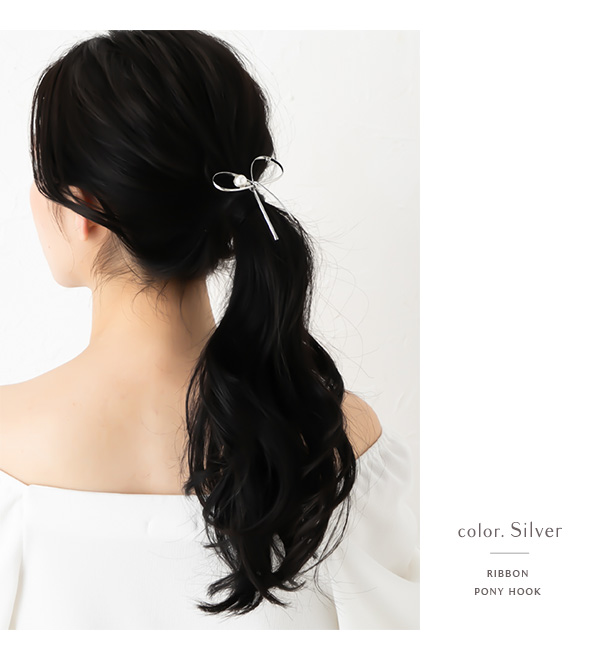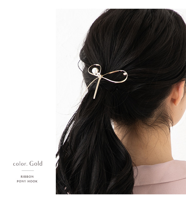 | ヘアゴムの結び目に差し込むだけでオシャレなアクセントを加えてくれるヘアアクセサリー 「ポニーフック」です。結んだような繊細なリボンモチーフにパールやストーンが華やかな ヘアアレンジを演出。ラフに まとめたヘアアレンジもスタイリッシュに決まります! | |