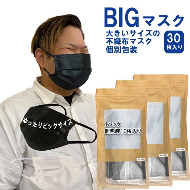 不織布マスク 大きなマスク 大きいサイズ プリーツマスク 2Lサイズ ビッグマスク 個別包装 快適な立体マスク3層構造 耳が痛くならない ブラック ホワイト ビッグサイズ 30枚入り
