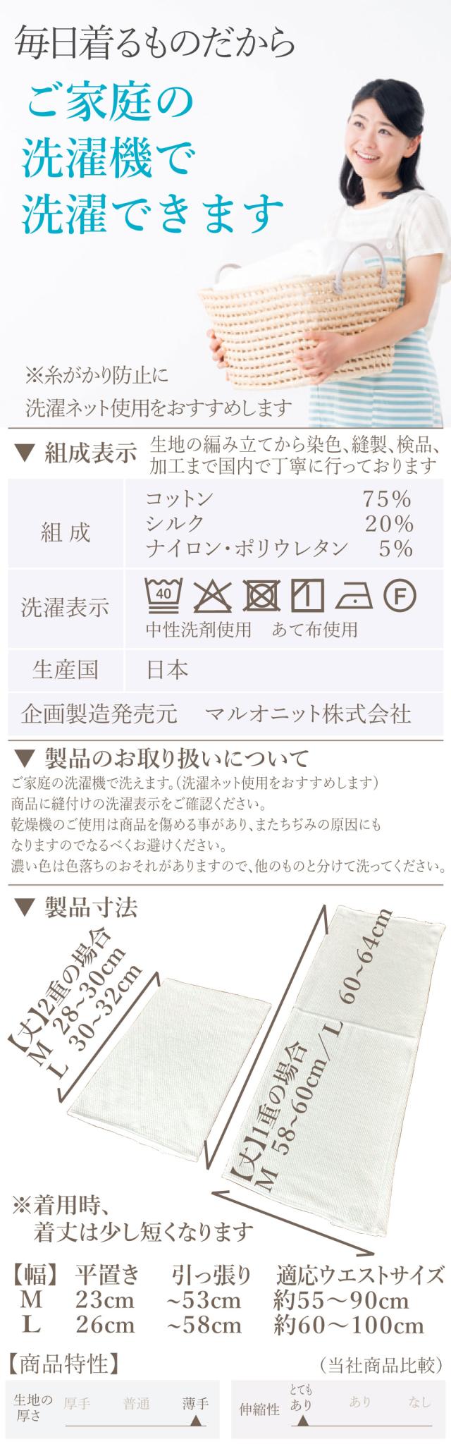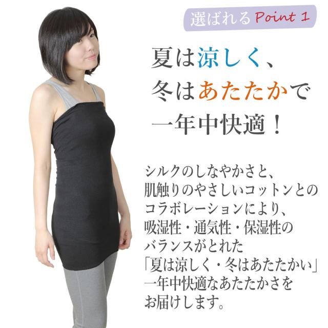 シルクのしなやかさと肌触りのやさしい綿とのコラボレーションにより、吸湿性・通気性・保温性のバランスがとれた「夏は涼しく、冬はあたたかい」一年中快適なあたたかさをキープする薄手でもあたたかい【シルクinコットンロング腹巻】