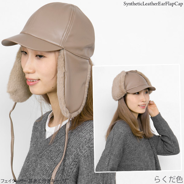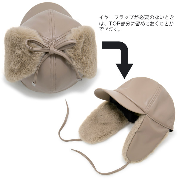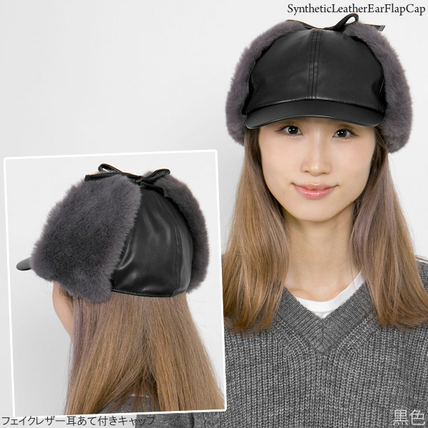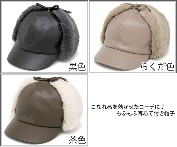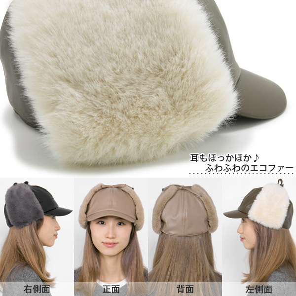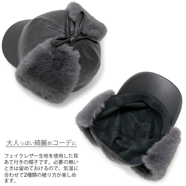 帽子 キャップ 耳あて付き レディース 秋冬 ファー イヤーフラップ 防寒対策 / フェイクレザー耳あて付きキャップ