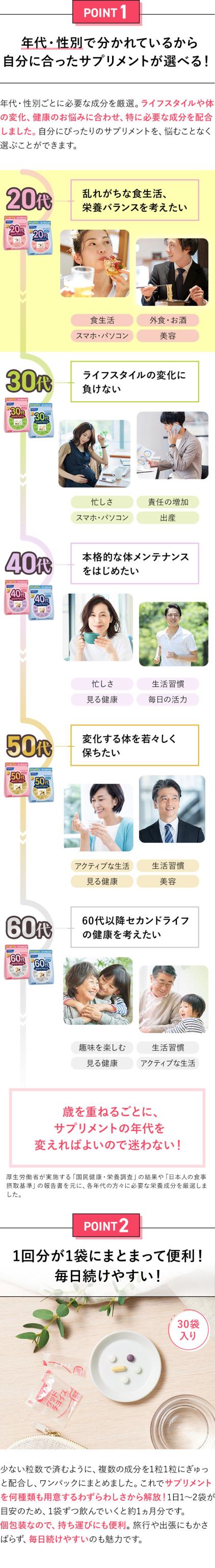 仕事やプライベートに忙しい20代女性のための成分を厳選し、ワンパックに。サプリメントをこれから摂ろうと思っている人、摂り方のわからない方におすすめ!年代別・性別に適したサプリメントを、ワンパックにいたしました。どなたでも、自分にあったサプリメントを簡単に選ぶことができます。<ビタミンB&C>