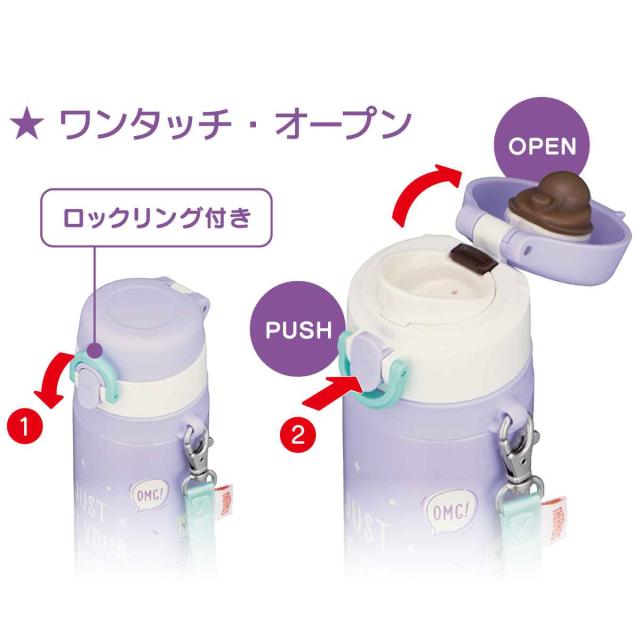 栓ユニットにはワンタッチで開けられるプッシュボタンが付いています。飲み口は直飲みタイプなので、片手の動作だけでスムーズに水分補給ができて便利です。また、ロックリング付きなので、持ち運びの際に不意に開いてしまう事を防いでくれます。