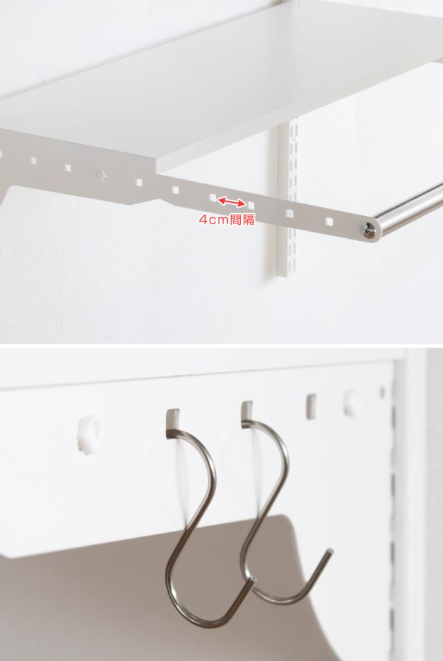 ブラケットには複数の穴が開いており、取り出しやすい位置にパイプを調整することができます。またブラケットの穴にフックなどを引っ掛けて、小物収納としても活用できます。