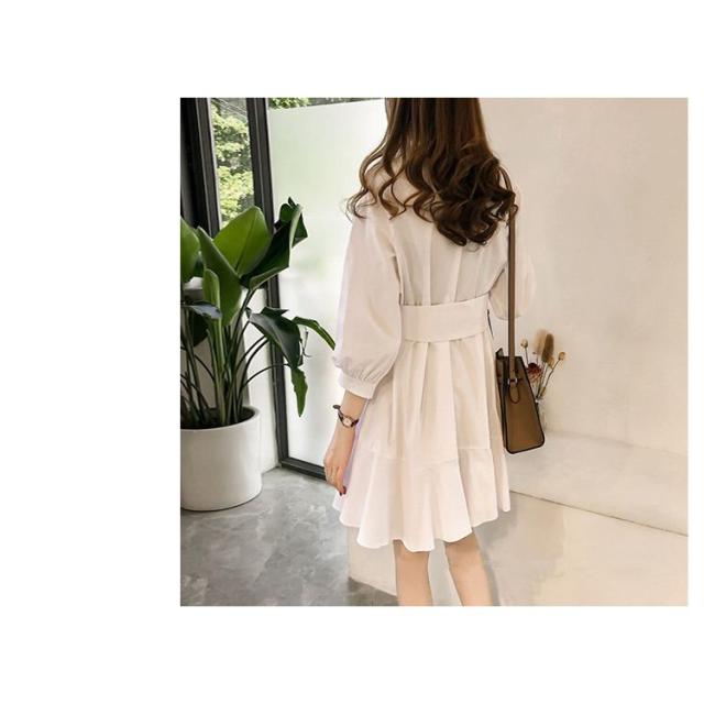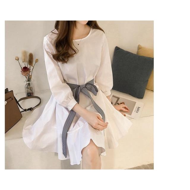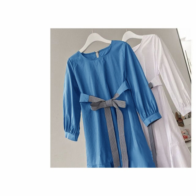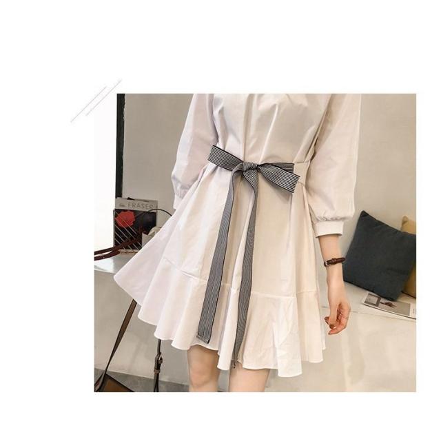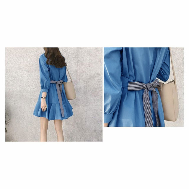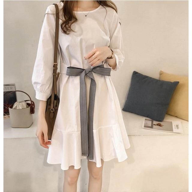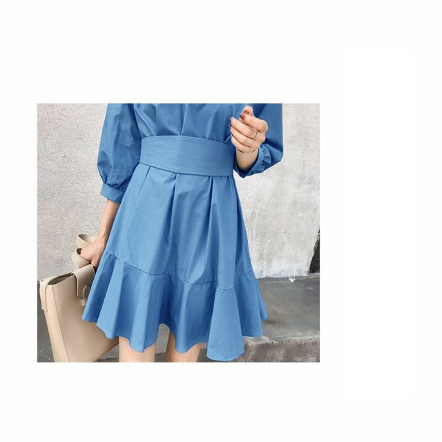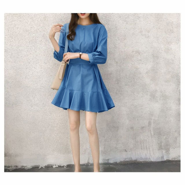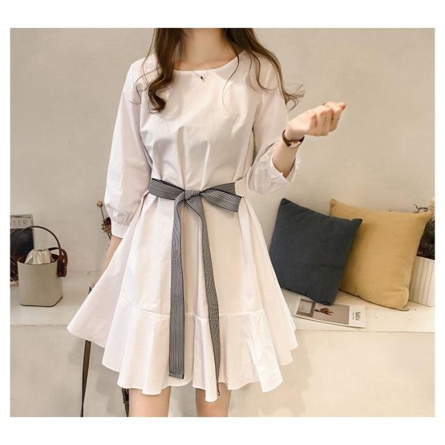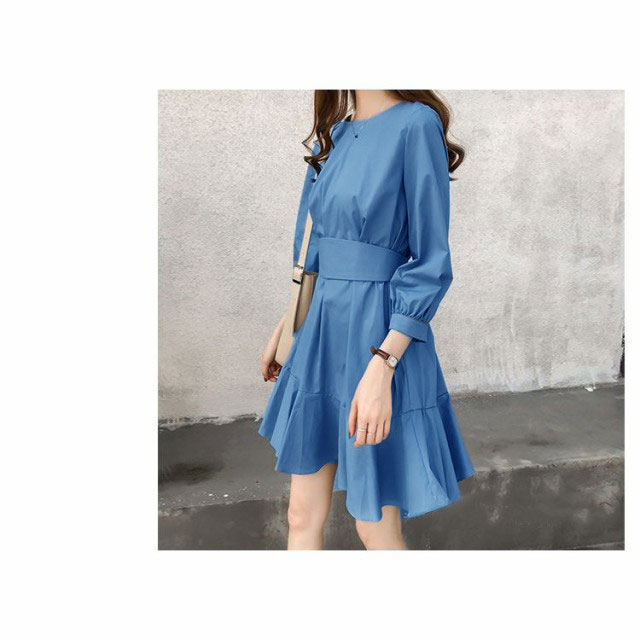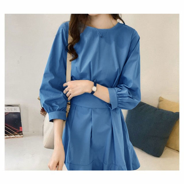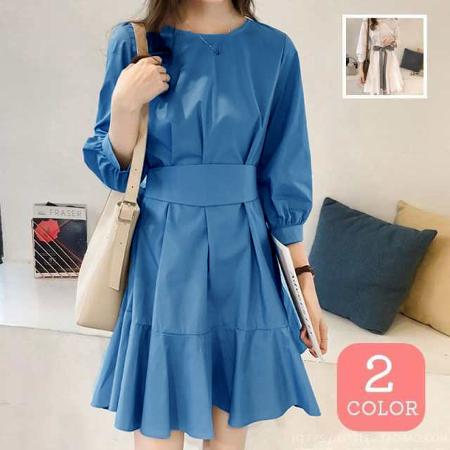 フレアワンピース レディース ミニ丈 七分袖 ボートネック パフスリーブ タック ウェストマーク ベルト シンプル 無地 婦人服