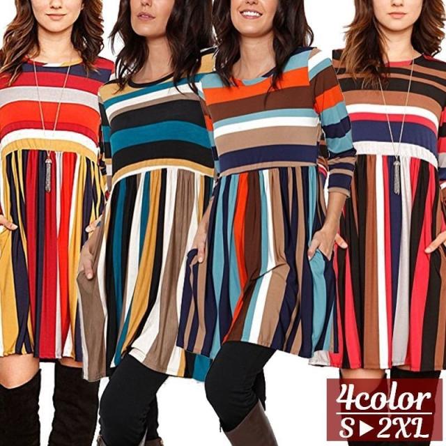 ミニワンピース 長袖 ラウンドネック ミニ丈 ショート丈 レディース フレアスカート ボーダー柄 ストライプ カジュアル カラフル 女性用 婦人用 S