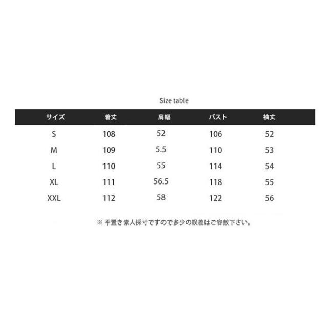 | サイズについての説明 | サイズ(cm) S: バスト98 袖長58 着丈64 M: バスト102 袖長59 着丈65 L: バスト106 袖長60 着丈66 XL: バスト110 袖長61 着丈67 2XL:バスト114 袖長62 着丈68 |