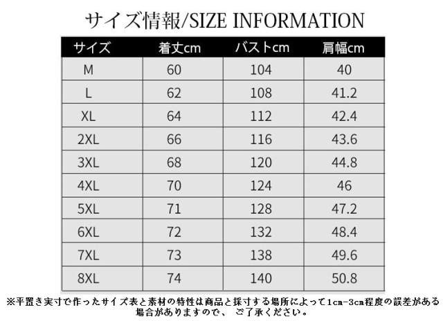 | サイズ | M L XL 2XL 3XL 4XL 5XL 6XL 7XL 8XL |