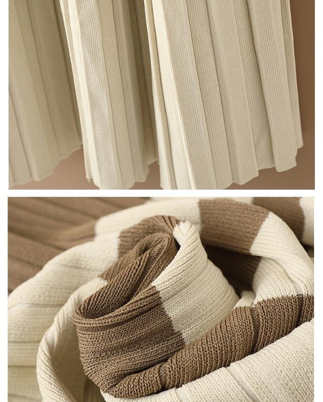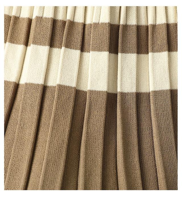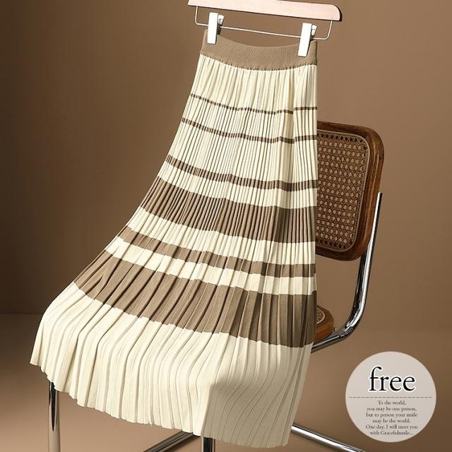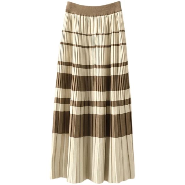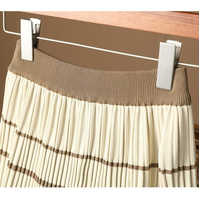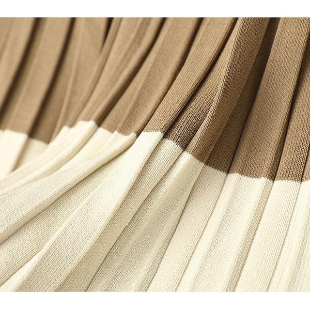 スカート レディース ボーダー ニット ニットスカート 膝下丈 ミモレ丈 ロング丈 ロングスカート プリーツ ベージュ ブラウン ホワイト 美人 デート/