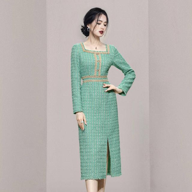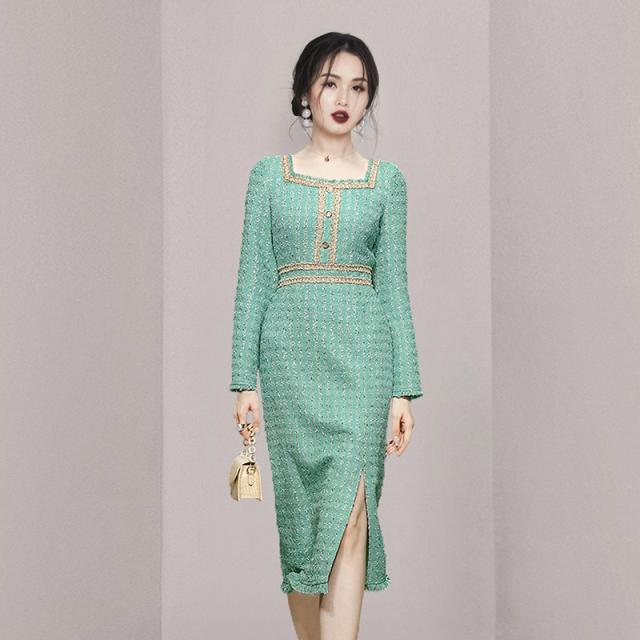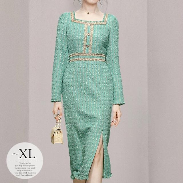 ワンピース レディース タイトワンピ 長袖 ツイード調 飾りボタン スリット 膝下 スクエアネック グリーン お出かけファッション ミセス 母親 休日/