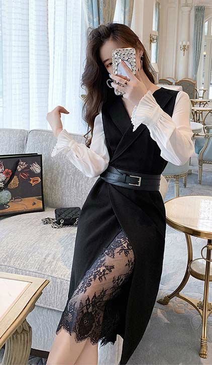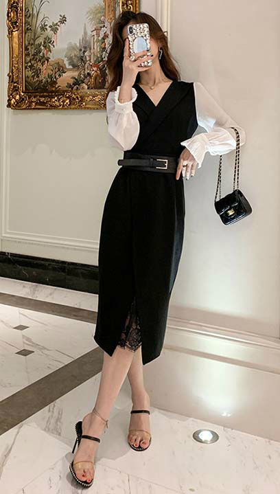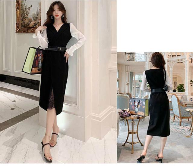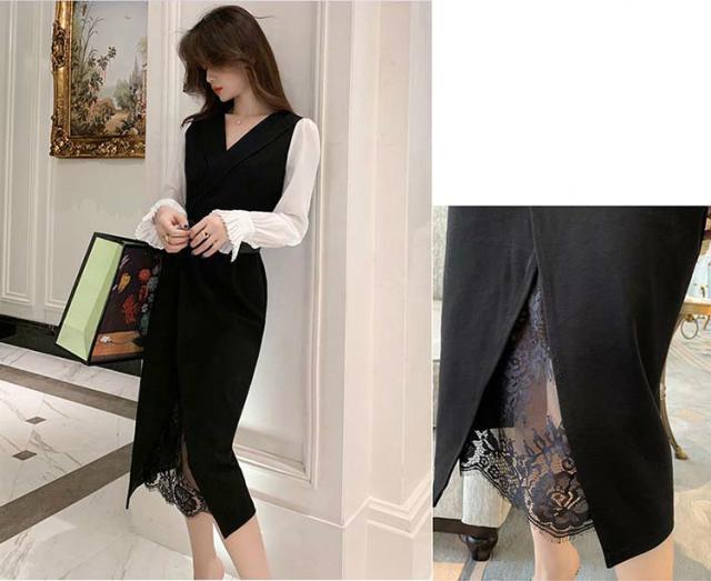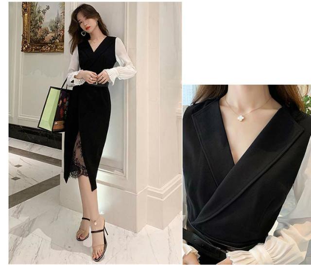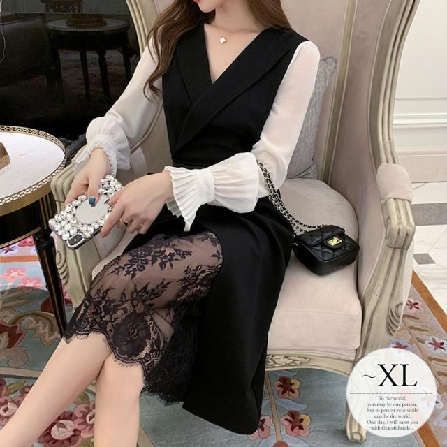 ワンピース レディース モノトーン 大人可愛い 異素材 ドッキングワンピ タイトワンピ カシュクール 長袖 ブラック 可愛い レディース