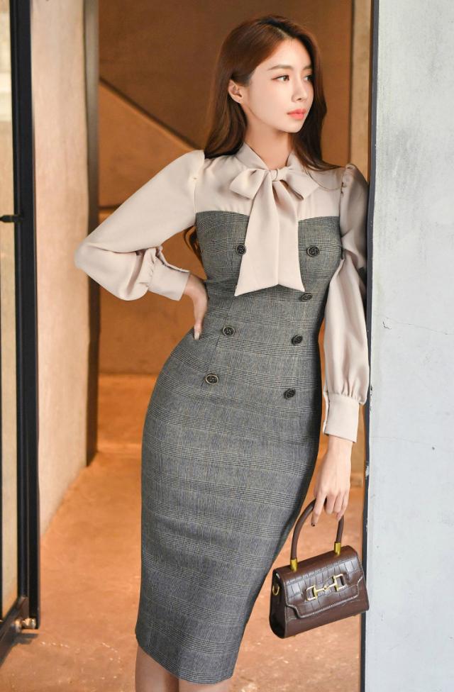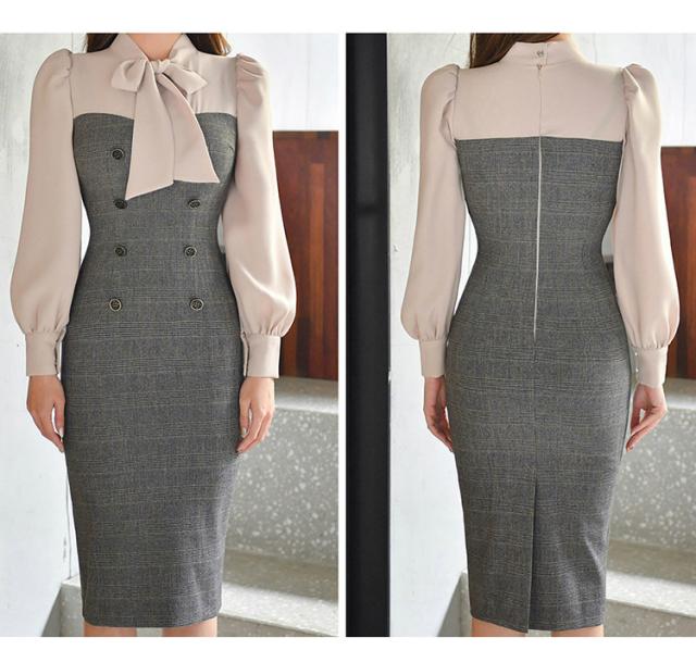 ワンピース レディース ドッキングワンピ タイトワンピ 大人エレガント グレンチェック リボン 異素材 グレー デート ママ イベント 魅力的 美人/