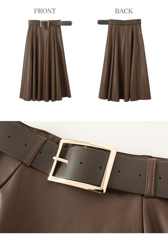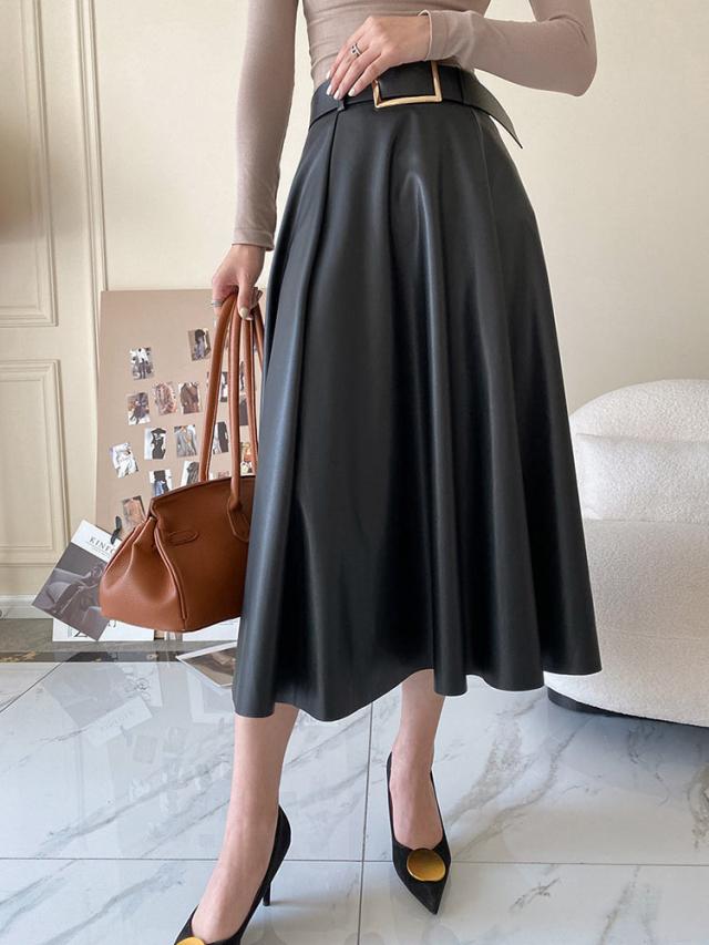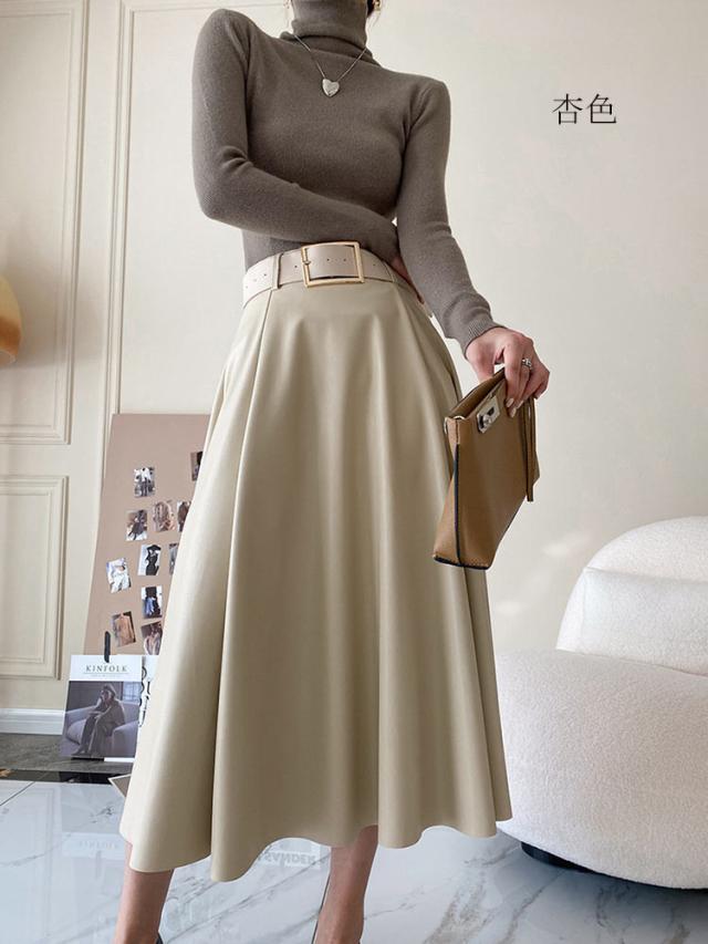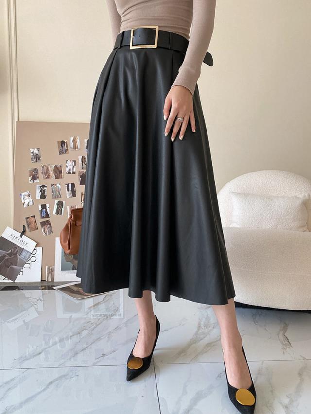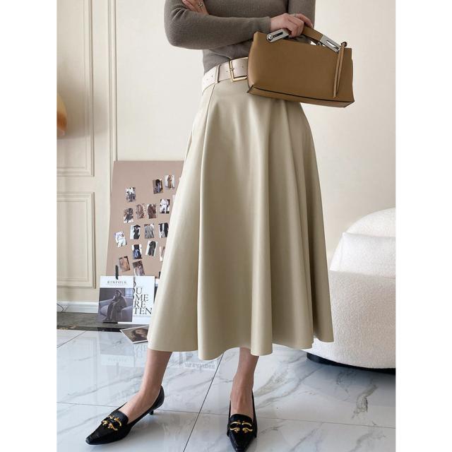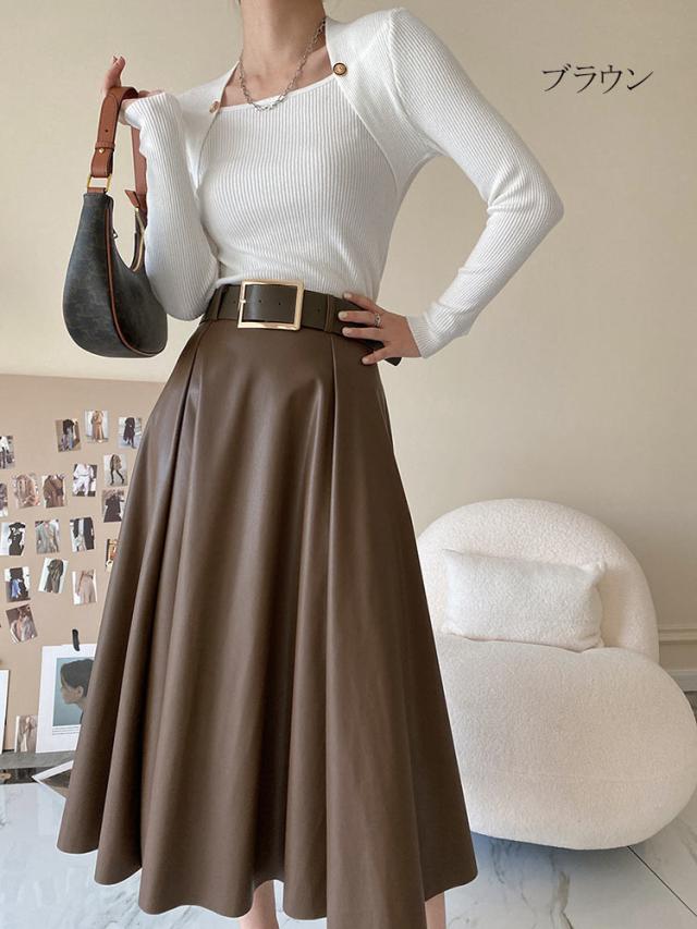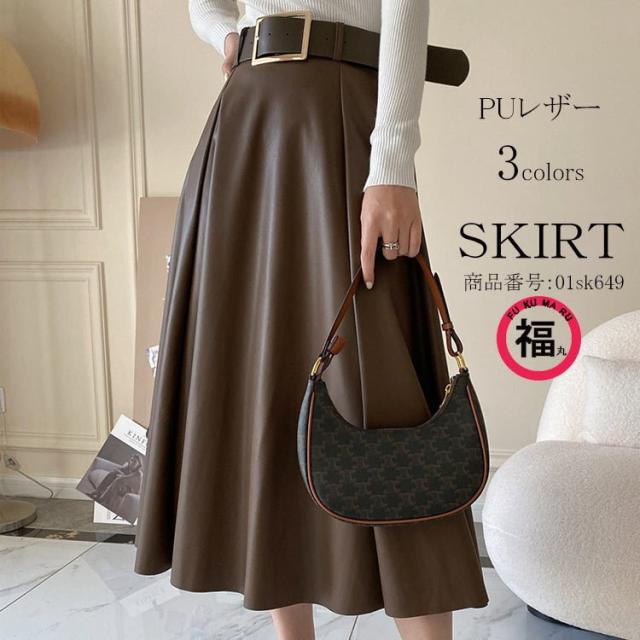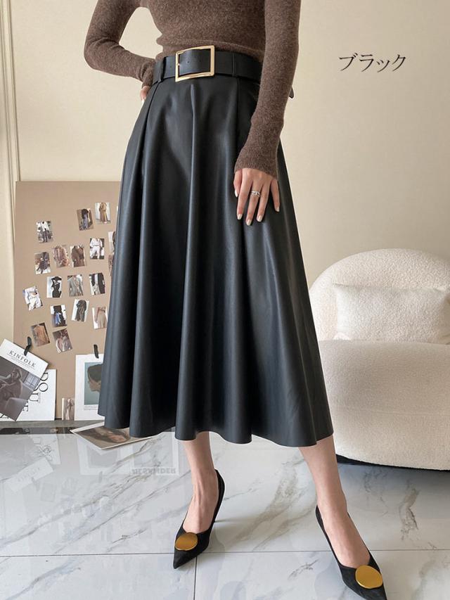 マキシスカート 秋冬 レディース Aラインスカート 冬物 PUレザー プリーツスカート ベルト付き 無地 通勤 OL おしゃれ 上品 コーデ 体型カバー