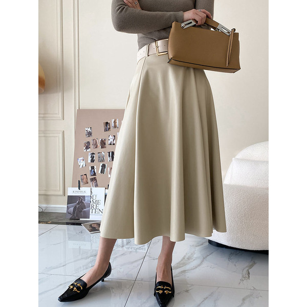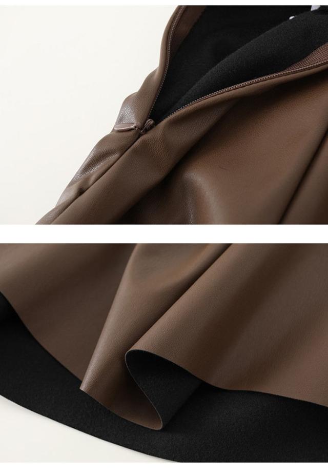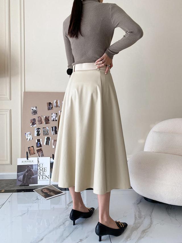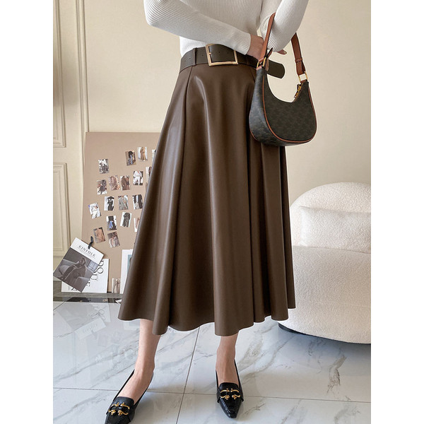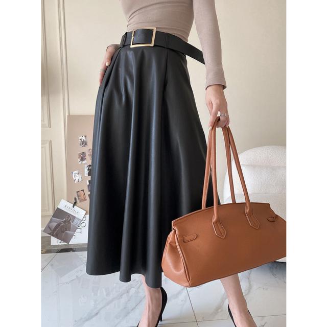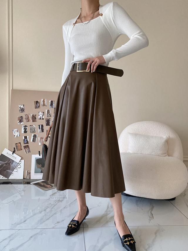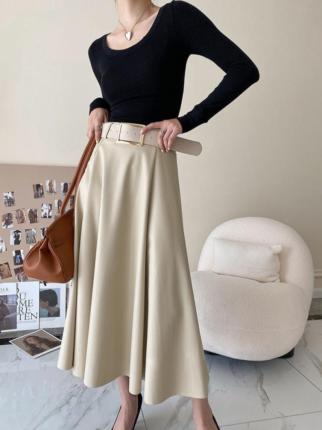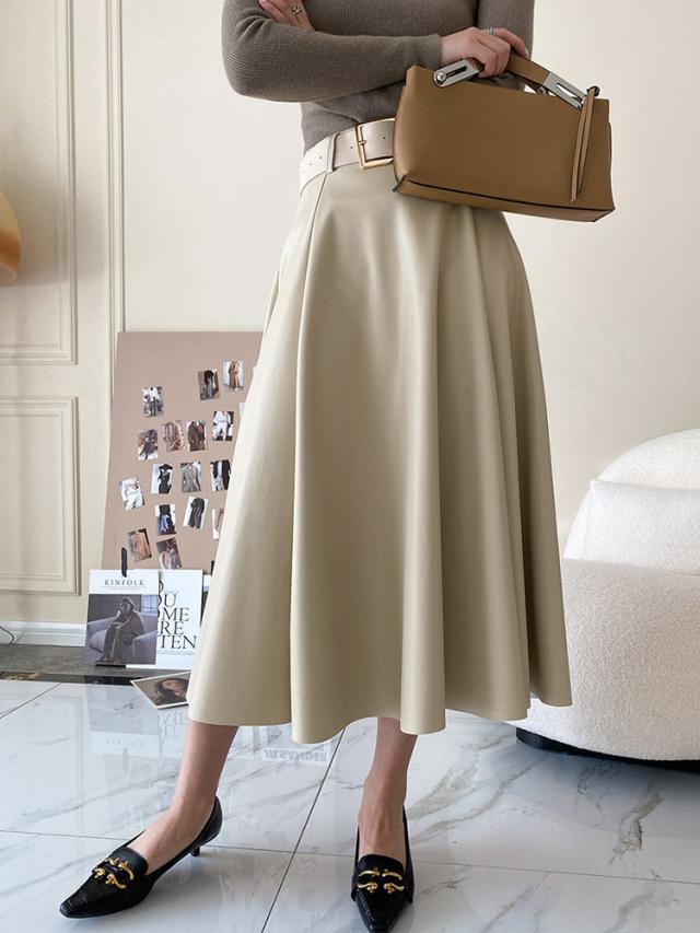 マキシスカート 秋冬 レディース Aラインスカート 冬物 PUレザー プリーツスカート ベルト付き 無地 通勤 OL おしゃれ 上品 コーデ 体型カバー