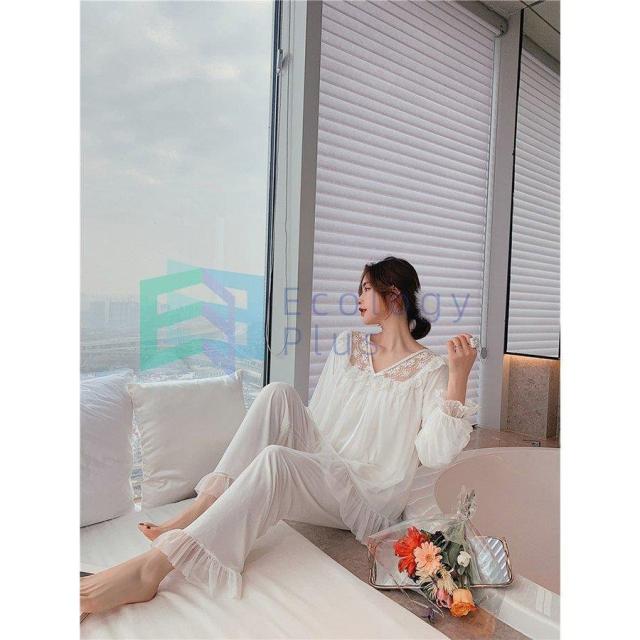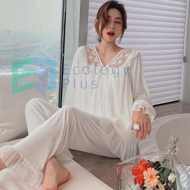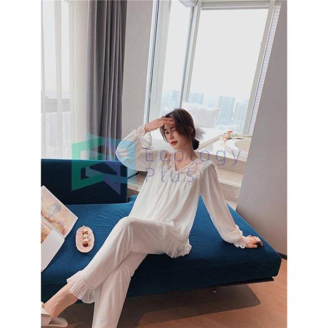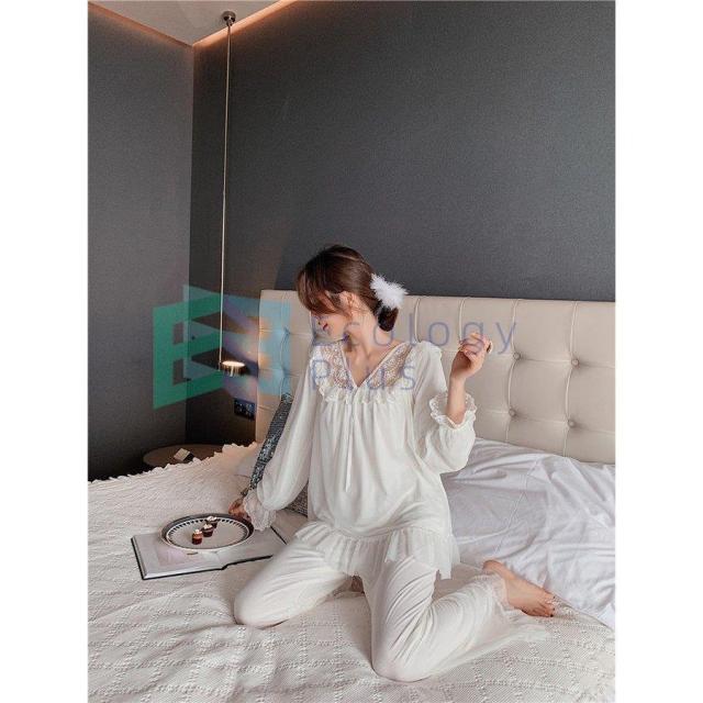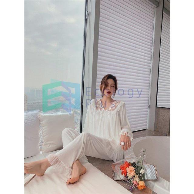 パジャマ ルームウェア レディース 春夏秋 長袖 パジャマ レースVネックルームウェア ゆったり 上下セット 大人可愛いパジャマ 女性 部屋着 オシャレお姫様風