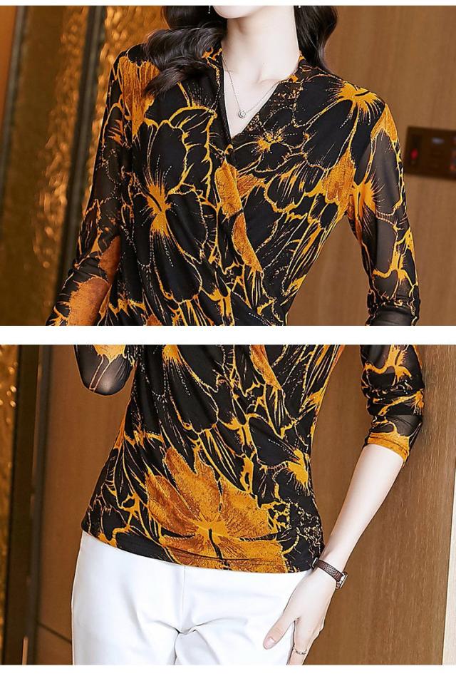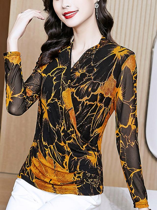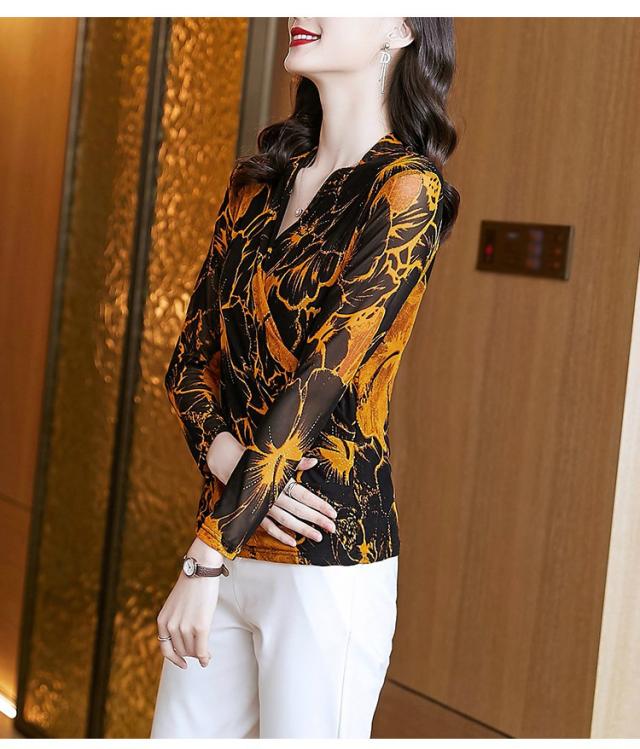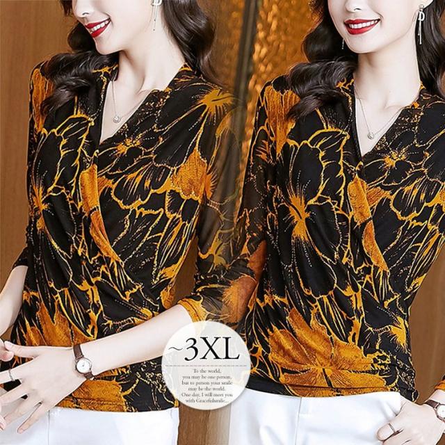 ブラウス トップス シャツ レディース 長袖 カシュクール 花柄 総柄 ゴージャス 食事会 パーティー ブラック イエロー 魅力的 モダン 可愛い イベント