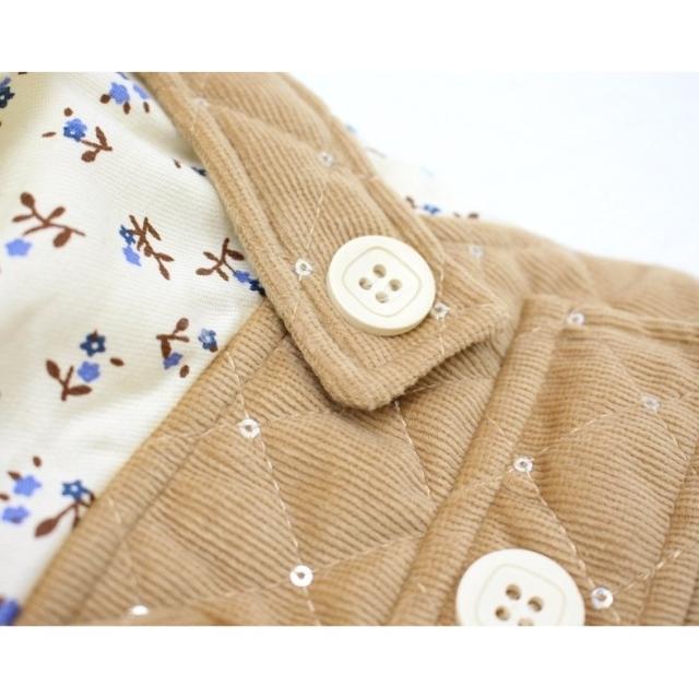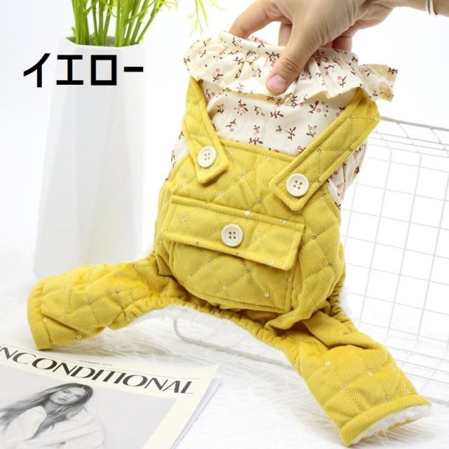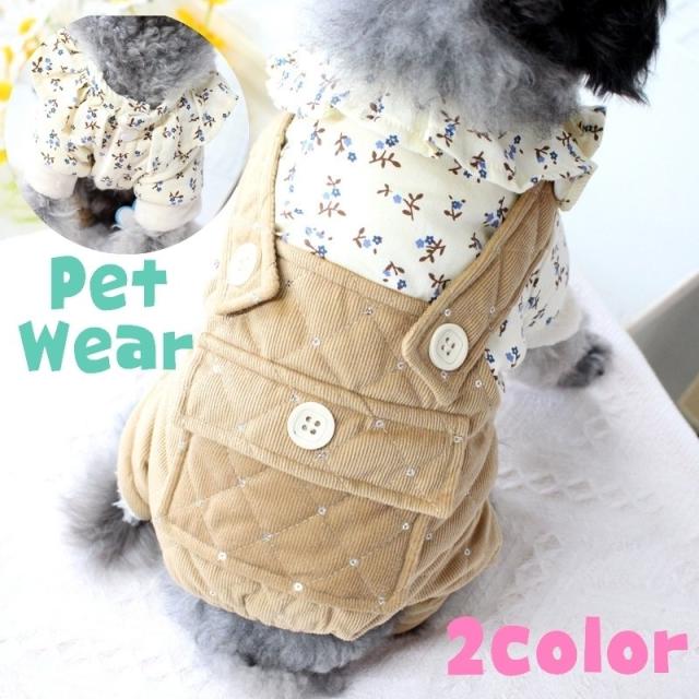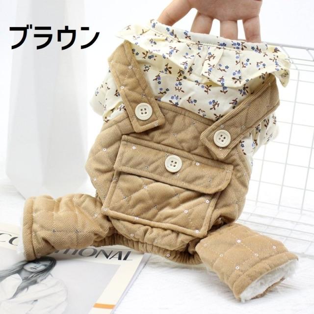 ツナギ カバーオール ペット用 オーバーオール 犬服 ズボン 犬用 猫用 重ね着風 裏ボア キルティング スパンコール 花柄 フリル 防寒 あったか