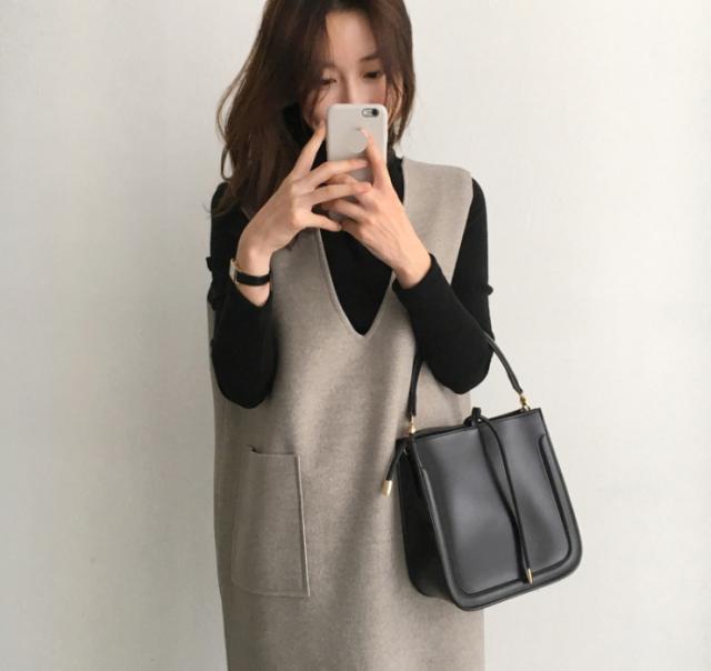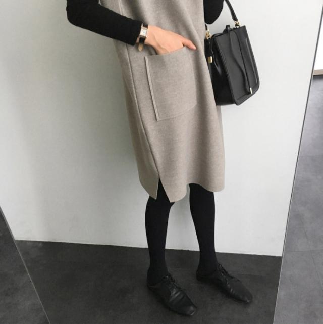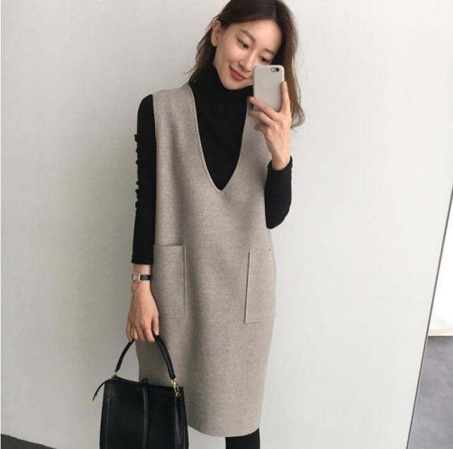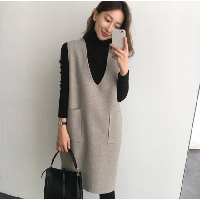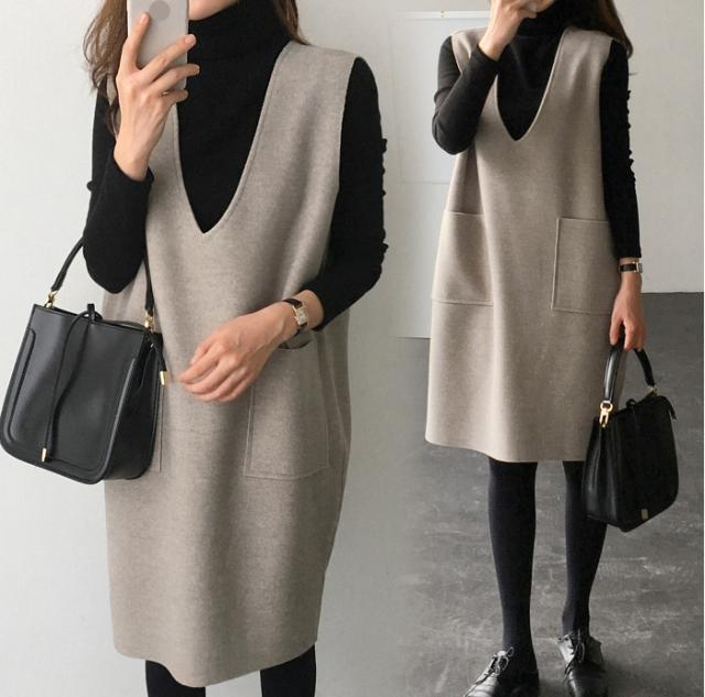 ワンピース レディース Vネック 膝丈 チュニック 重ね着 ジャンパースカート レイヤード 可愛い 秋冬 韓国ファッション
