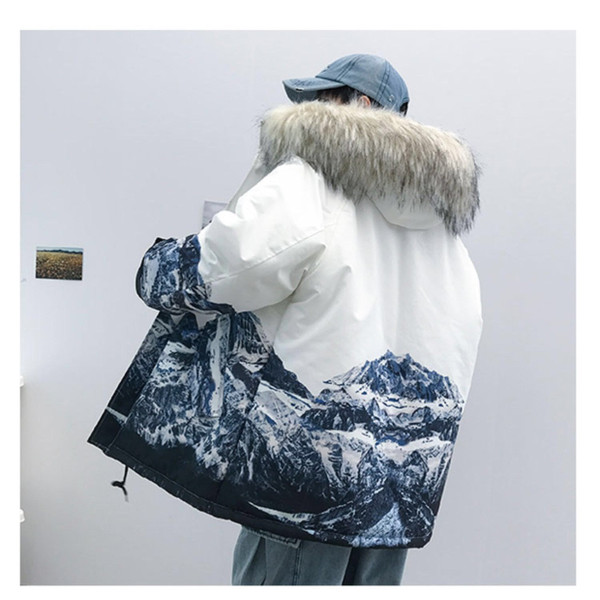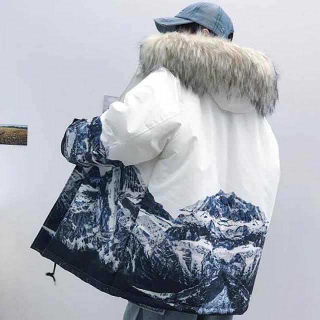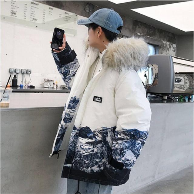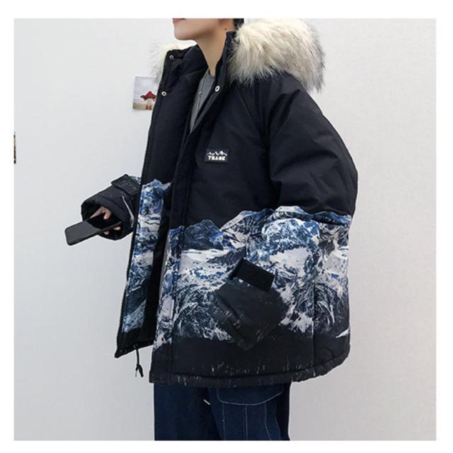 ダウンジャケット メンズ ダウンコート 40代 メンズファッション ジャケット 雪山柄 カジュアル おしゃれ 冬服 紳士服 中綿コート 50代 黒アウター ホワイト