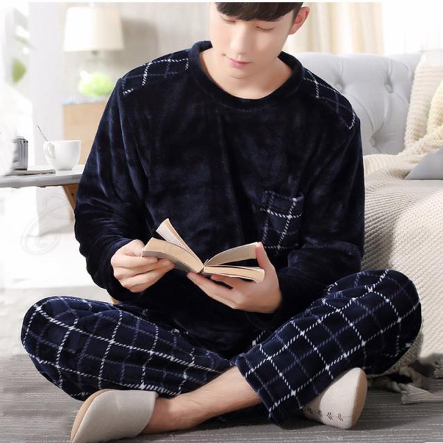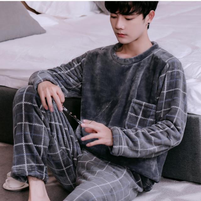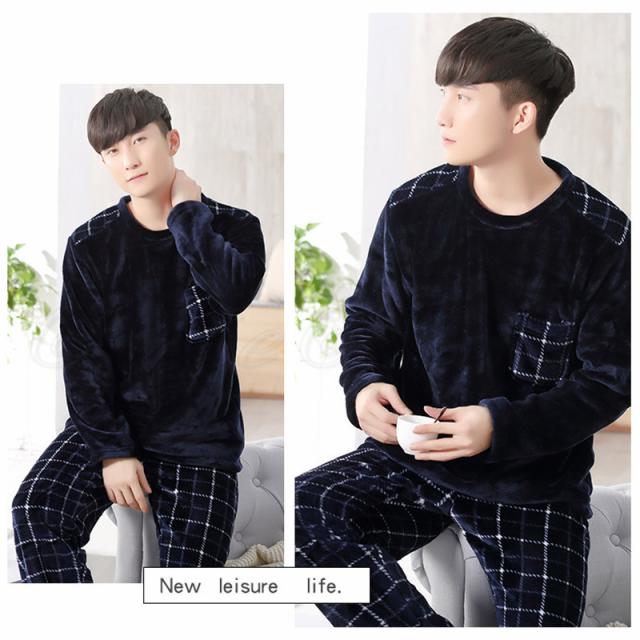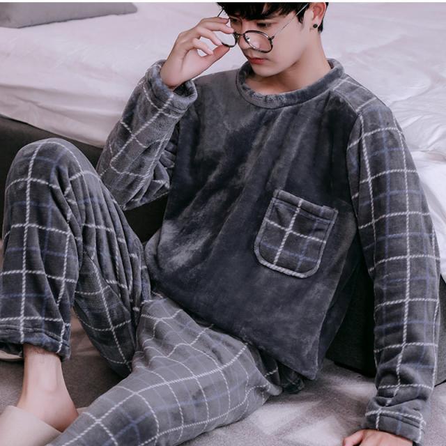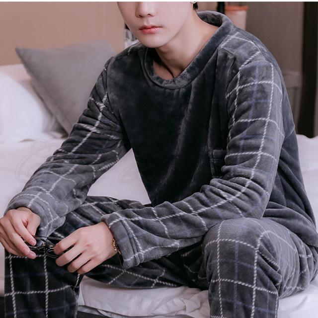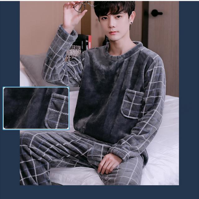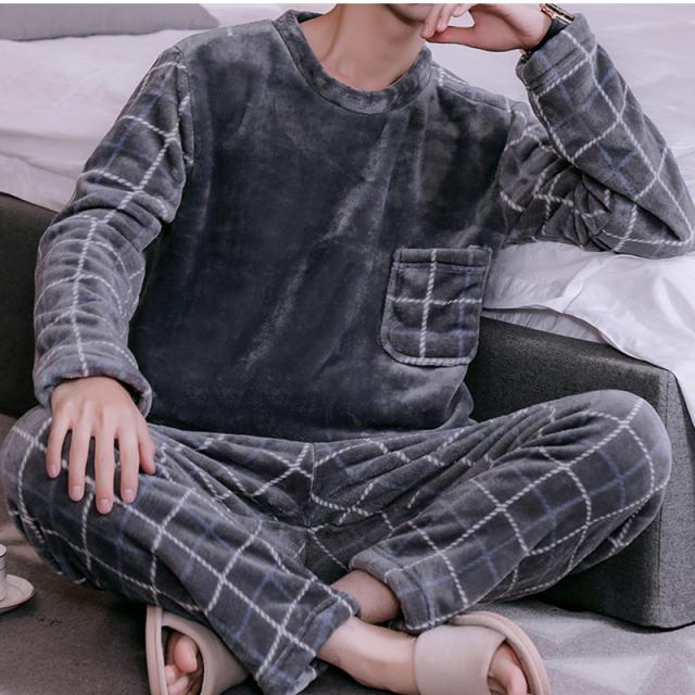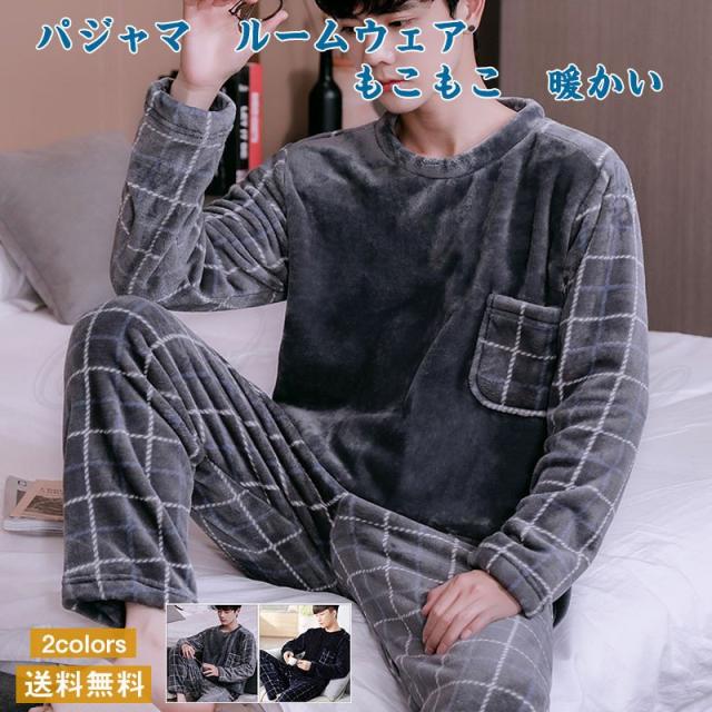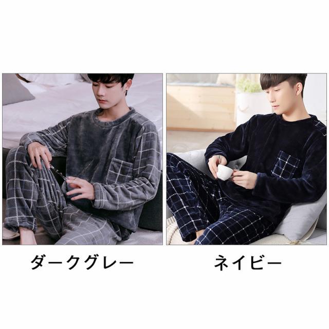パジャマ メンズ ルームウェア チェック柄 クルーネック 長袖 上下セット 厚手 胸ポケット 大きいサイズ もこもこ 暖かい 秋冬 きれいめ おしゃれ