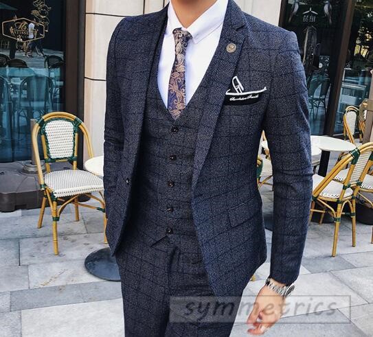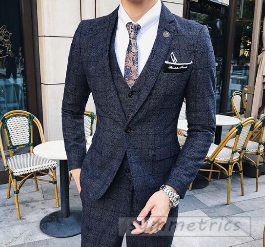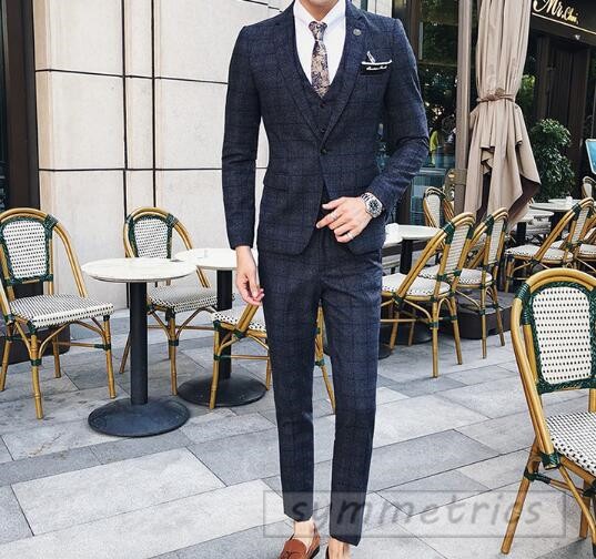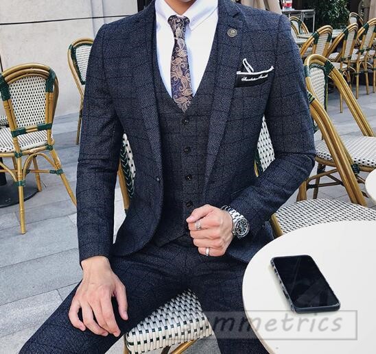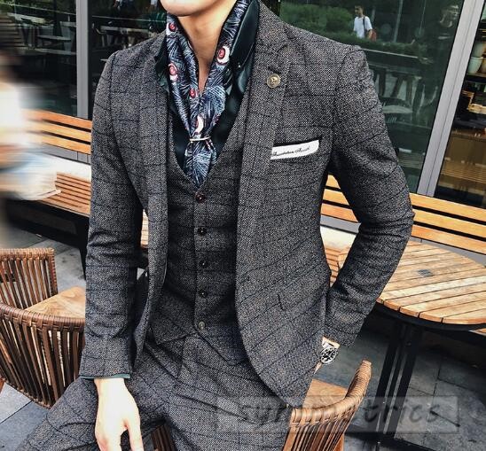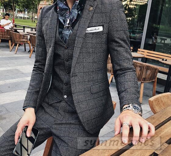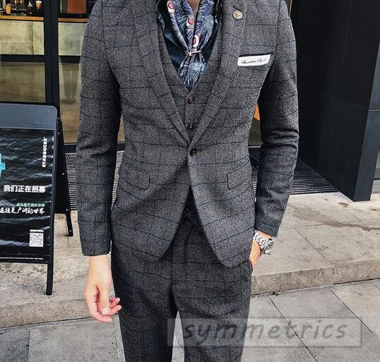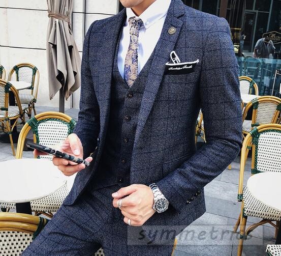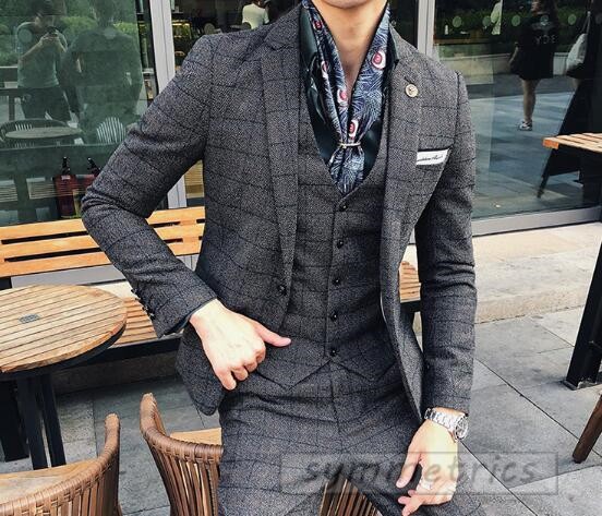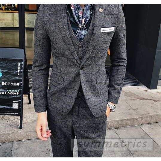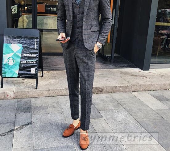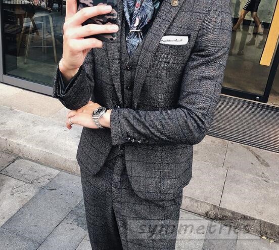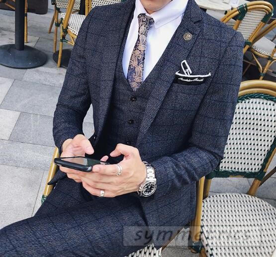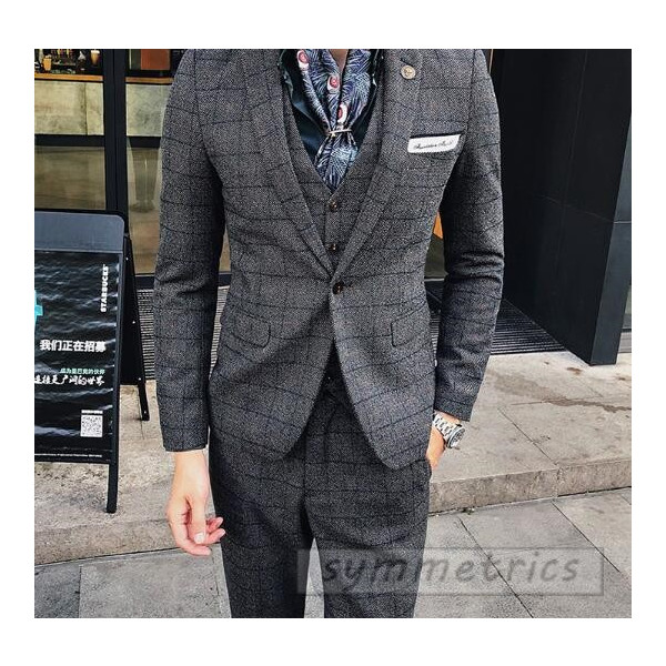 チェック柄スタイリッシュスーツ3ピーススリムスーツ スリーピーススーツ メンズフォーマルスーツ結婚式二次会パーティーギフト