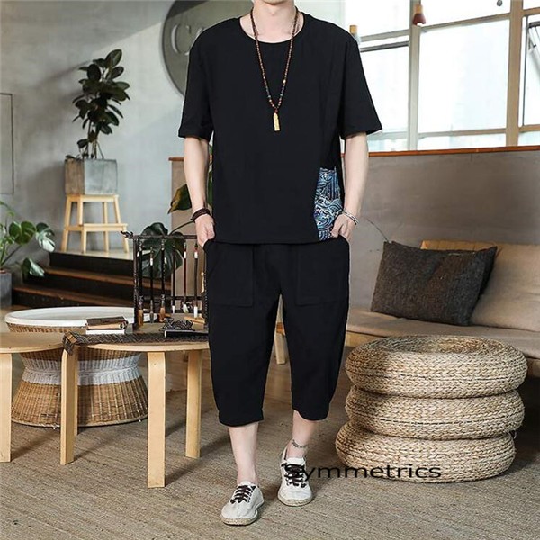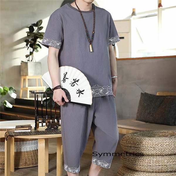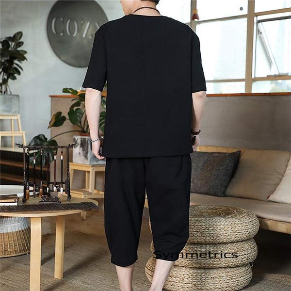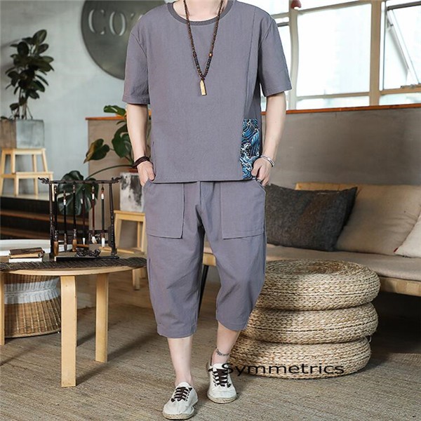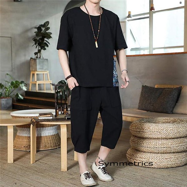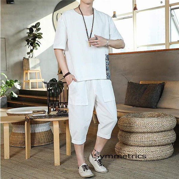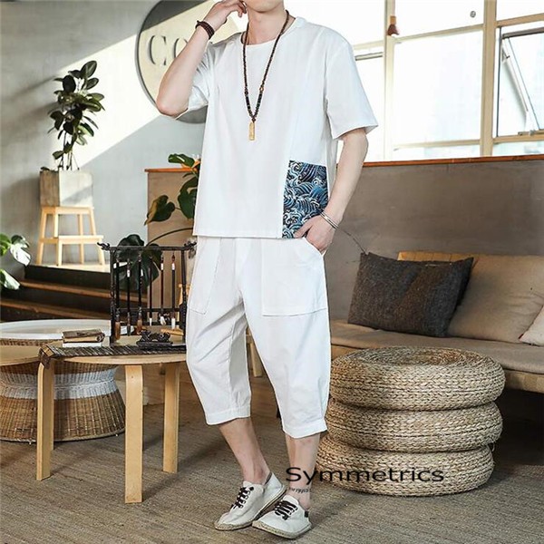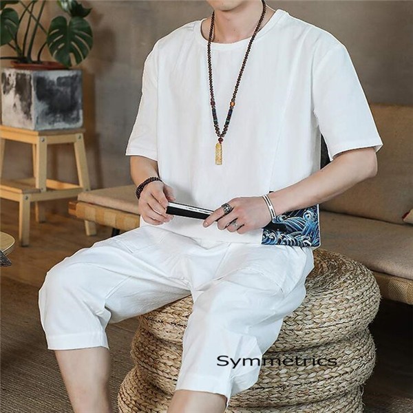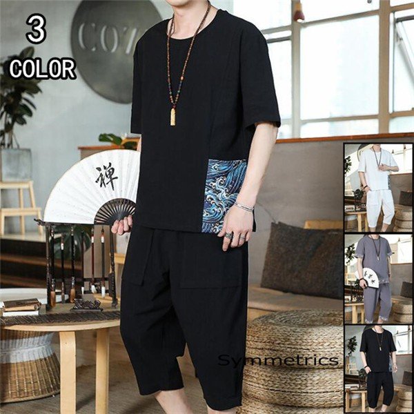 綿麻上下セット セットアップ リネン 夏 半袖 薄手 七分丈サルエルパンツ メンズ ワイドパンツ ルームウェア Tシャツ トップス ズボン 部屋着 無地