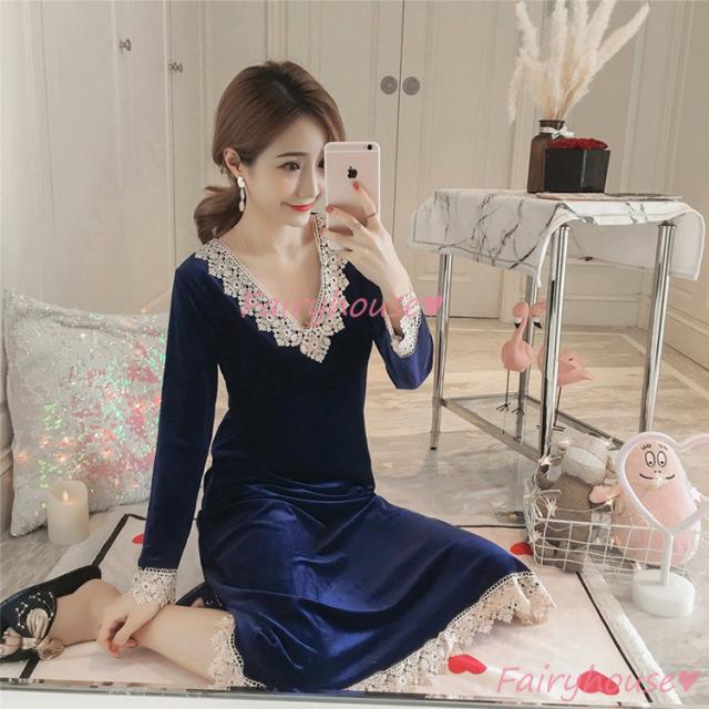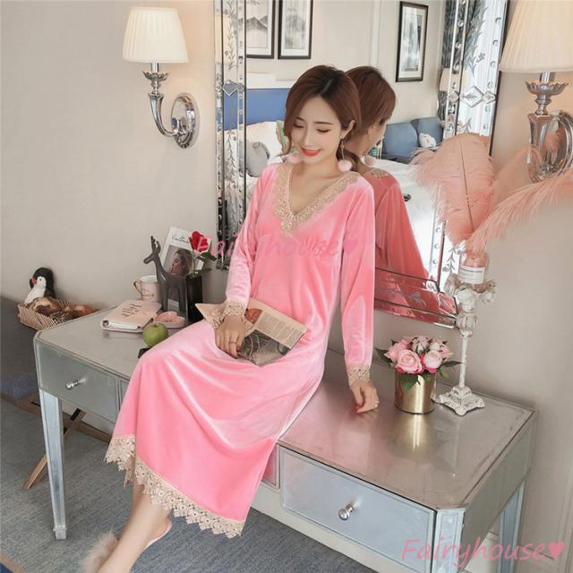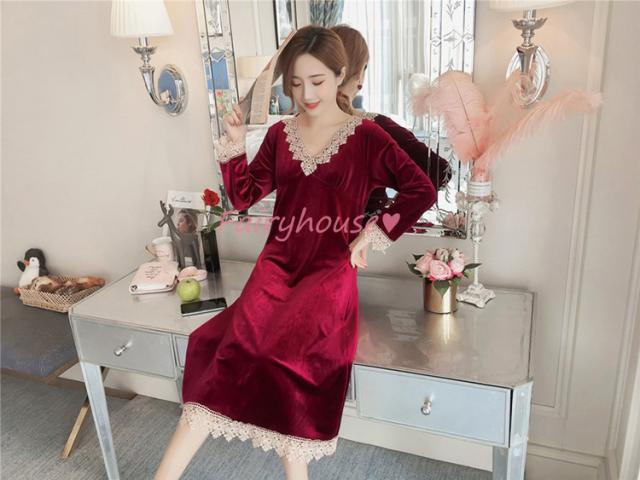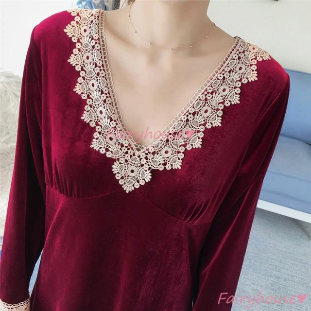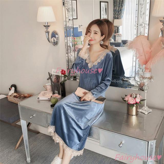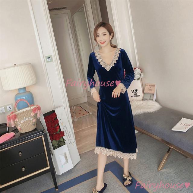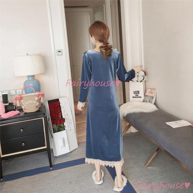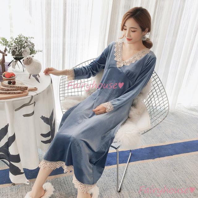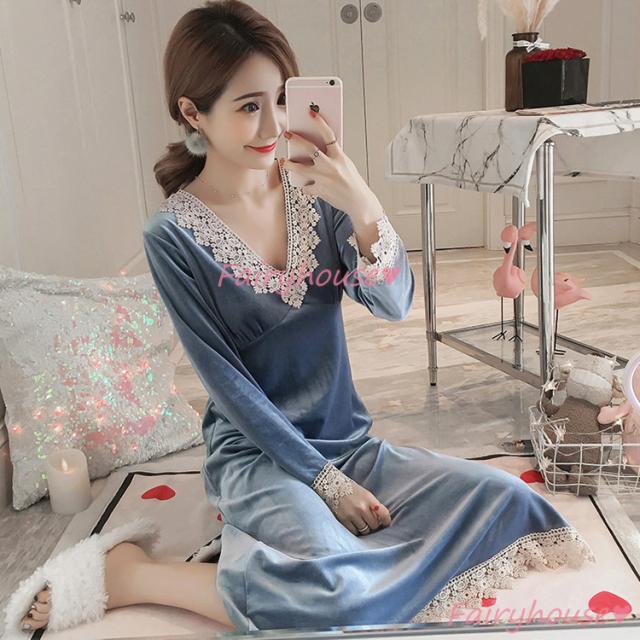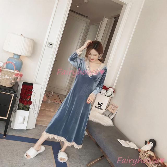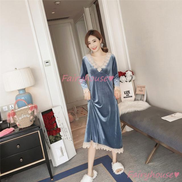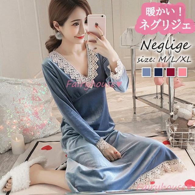 ネグリジェ 冬 長袖ワンピース ベルベット レースVネックネグリジェ ロング モコモコルームウェア レディース 厚手 暖かい 姫 ナイトローブ 大人可愛い セクシー