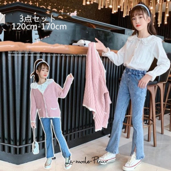 韓国子供服 セットアップ 女の子 秋服 スウィート おしゃれ 3点セット セーター + シャツ + ジーンズ キッズ ガールズ 上下セット オシャレお出かけ 通学着