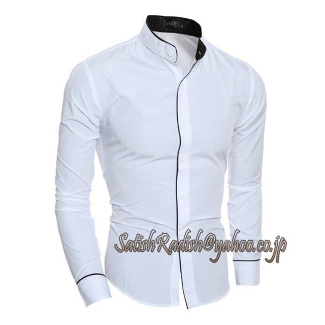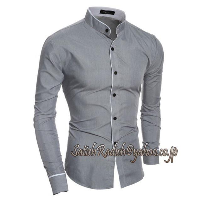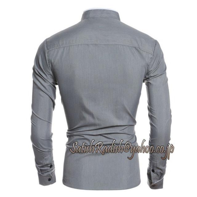 ワイシャツ メンズ 無地 立ち襟 春 夏 秋 スタンドカラー 細身 スリム 長袖 切替 無地 コットン カジュアル 人気