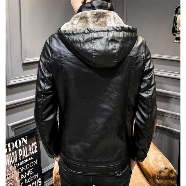 革ジャン メンズ ライダースジャケット 裏起毛 フード付き PUレザー ストリート アウター 欧米風 カジュアル 防寒 保温 春 秋 冬