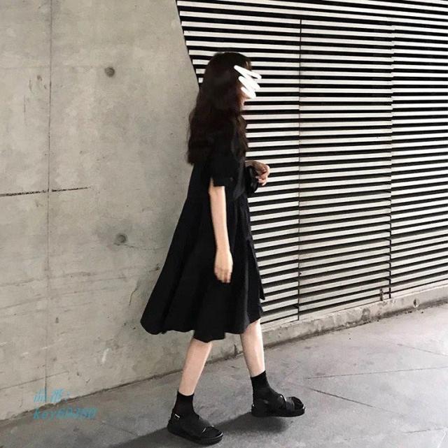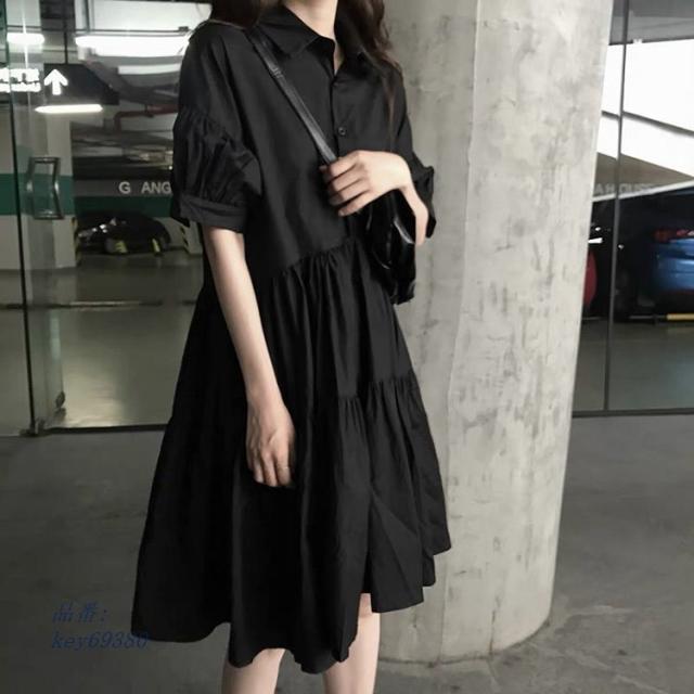 シャツワンピース レディース 40代 半袖ワンピース 韓国風 ゆったり 膝丈ワンピース シャツワンピ 黒フレアスカート 春夏 オシャレ 大人可愛い30代 キレイめ