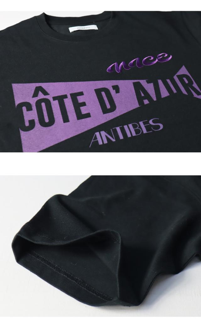 素材には、しっかりとした厚みがありながらも、ソフトで着やすい18/単糸綿天竺を採用。グラフィックはフランス南部の有名なリゾート地”コートダジュール”のお土産TEEをイメージし、プリントと刺繍で表現しています。