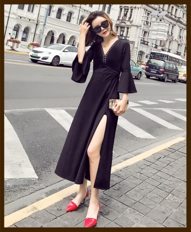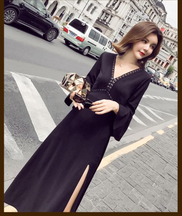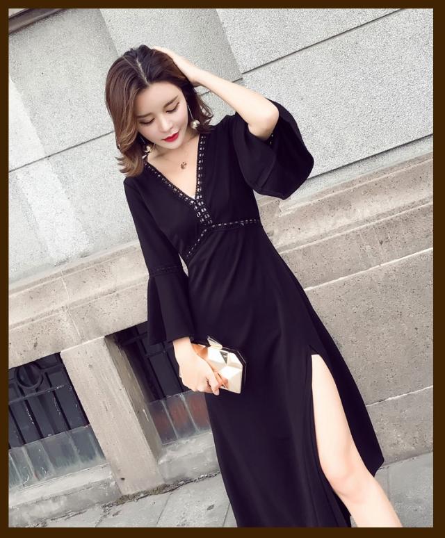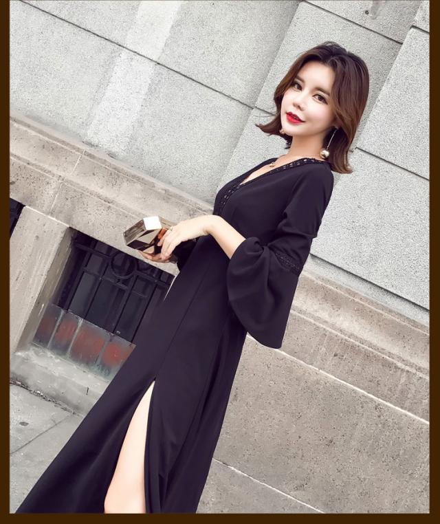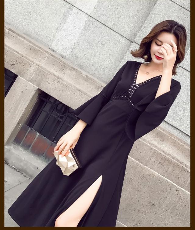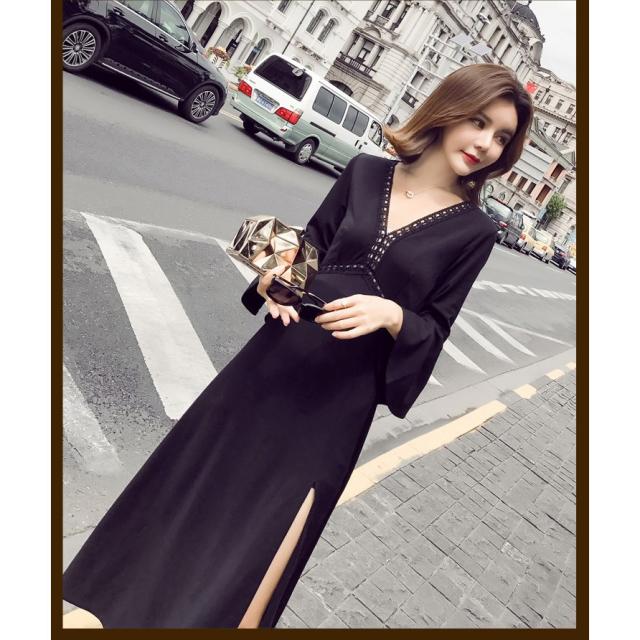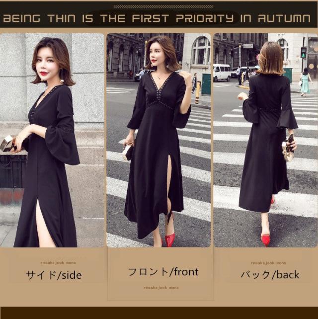 ワンピース レディース マキシワンピース マキシ丈 長袖 秋 新作 シフォンワンピ スリットワンピース V襟 上品 フェミニン S〜XL
