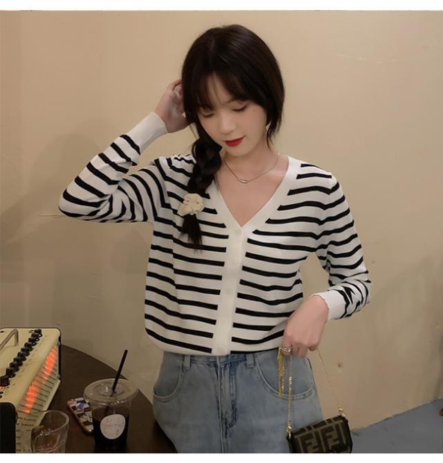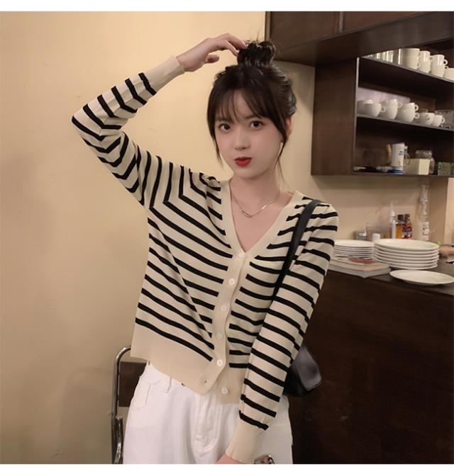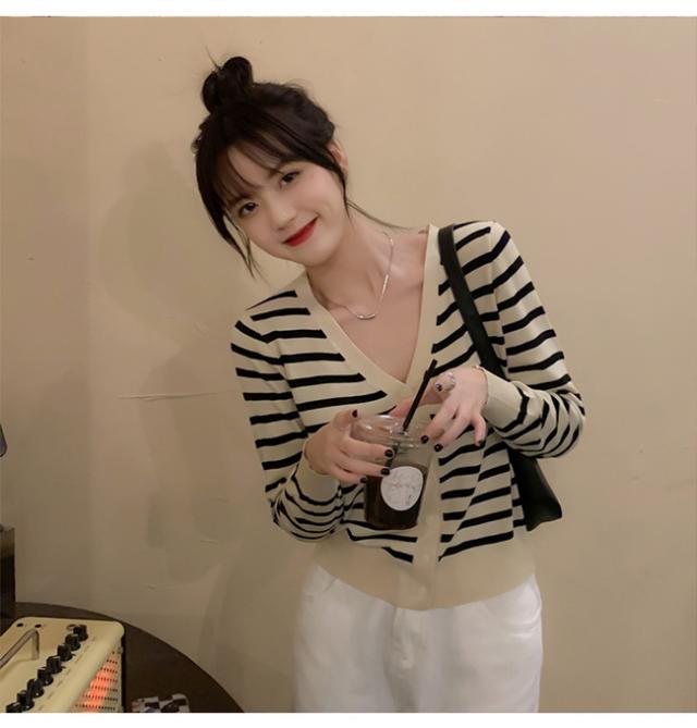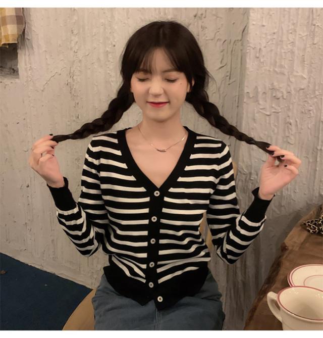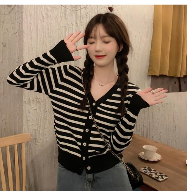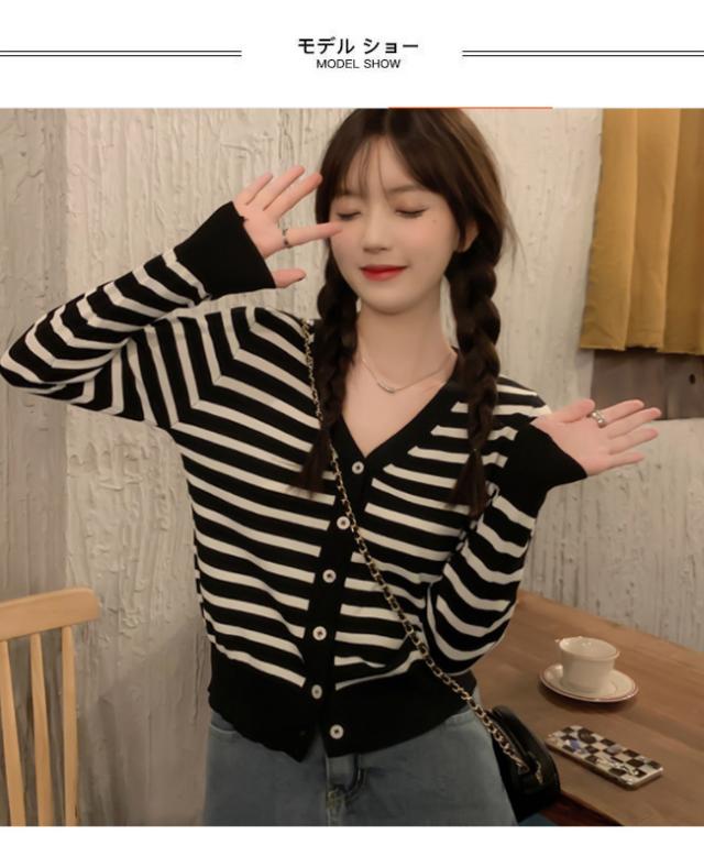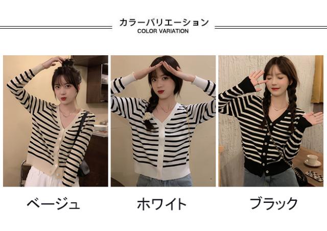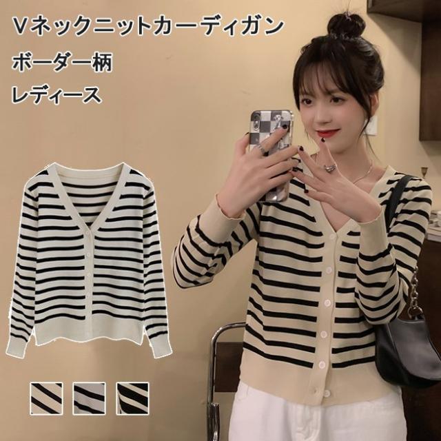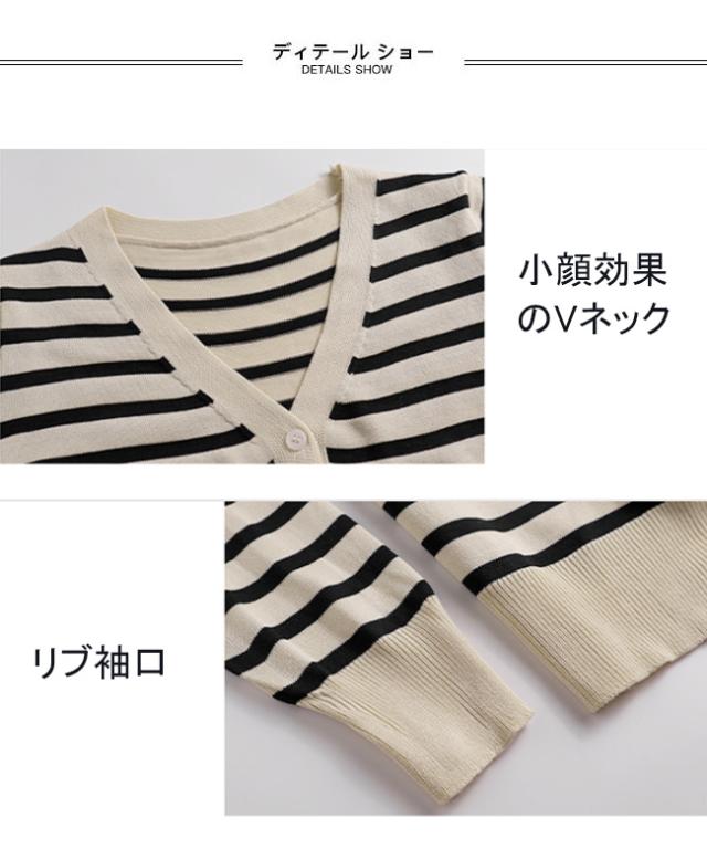 ニットカーディガン レディース Vネック カーディガン ボーダー柄 レトロ ボタンカーディガン ゆったり ショートカーディガン