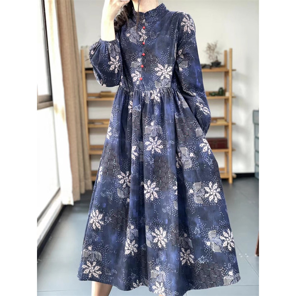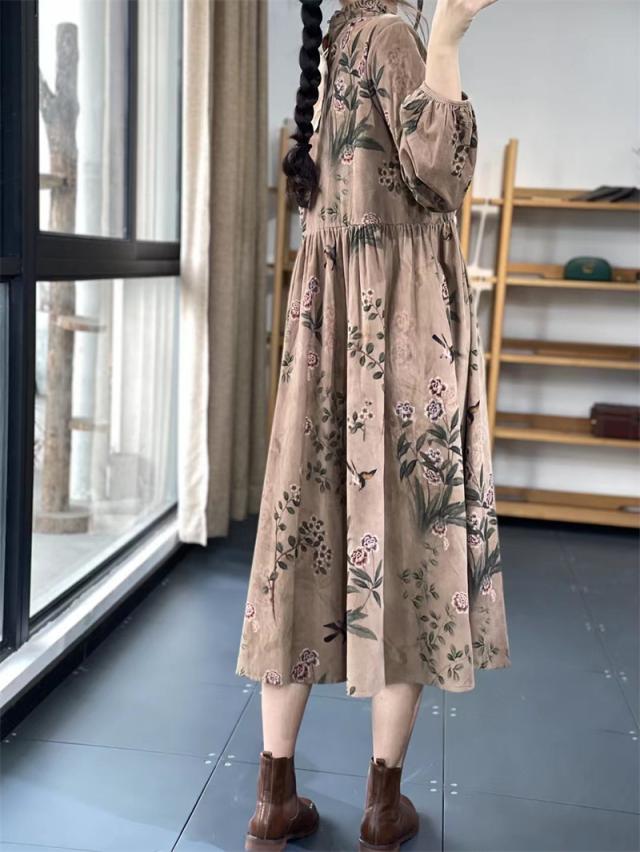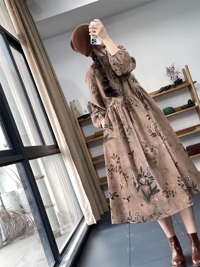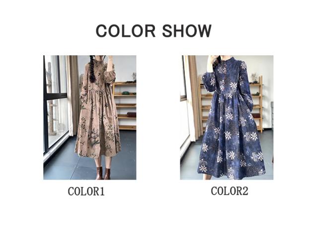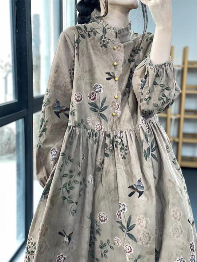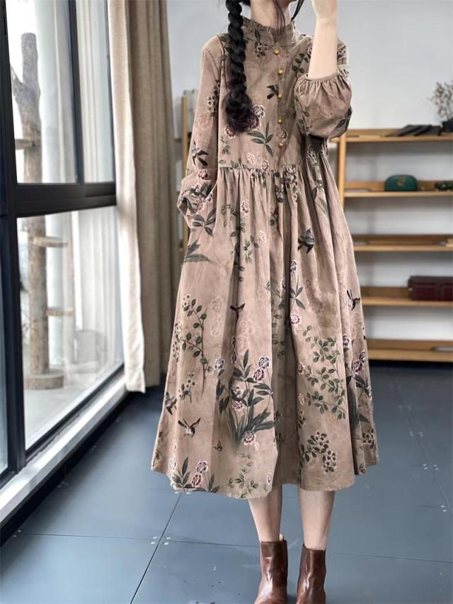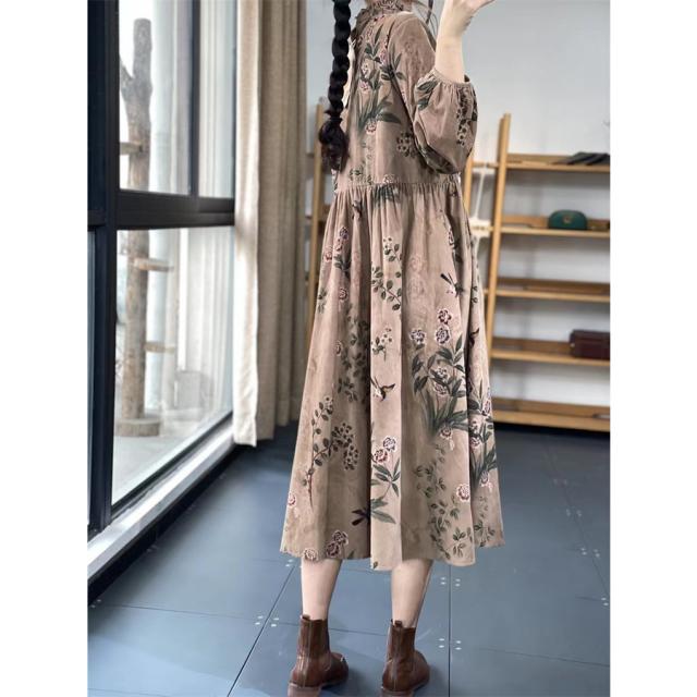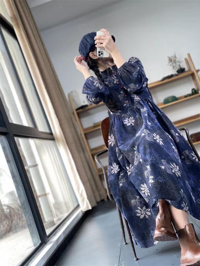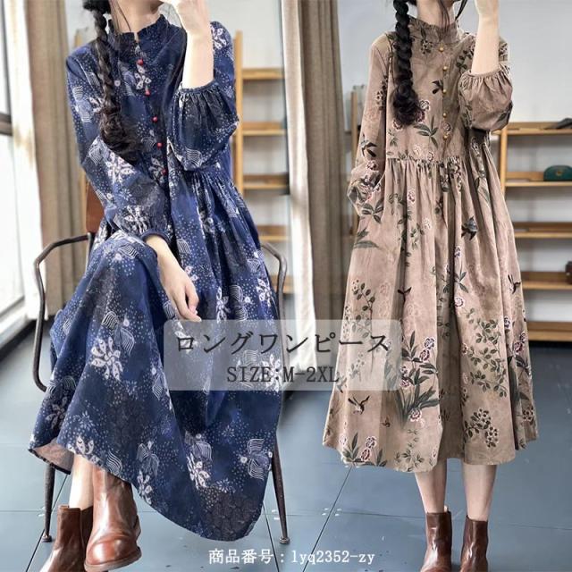 ワンピース ロングワンピース レディース 花柄 ミモレワンピース 長袖 バルーンスリーブ ゆったり 体型カバー 秋 冬 ロング丈 ロングワンピ フリルネック 可愛い