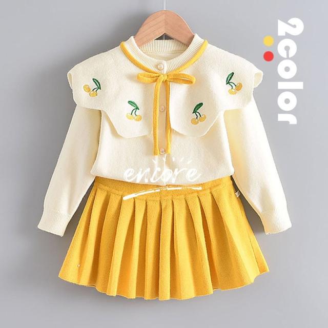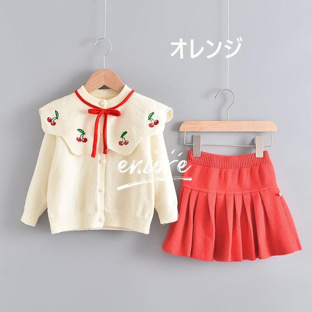 韓国子供服 女の子 長袖 春秋 セットアップ 上下セット ニットカーディガン セーター スカート キッズ ジュニア 2点セット リボン 可愛い おしゃれ 2色