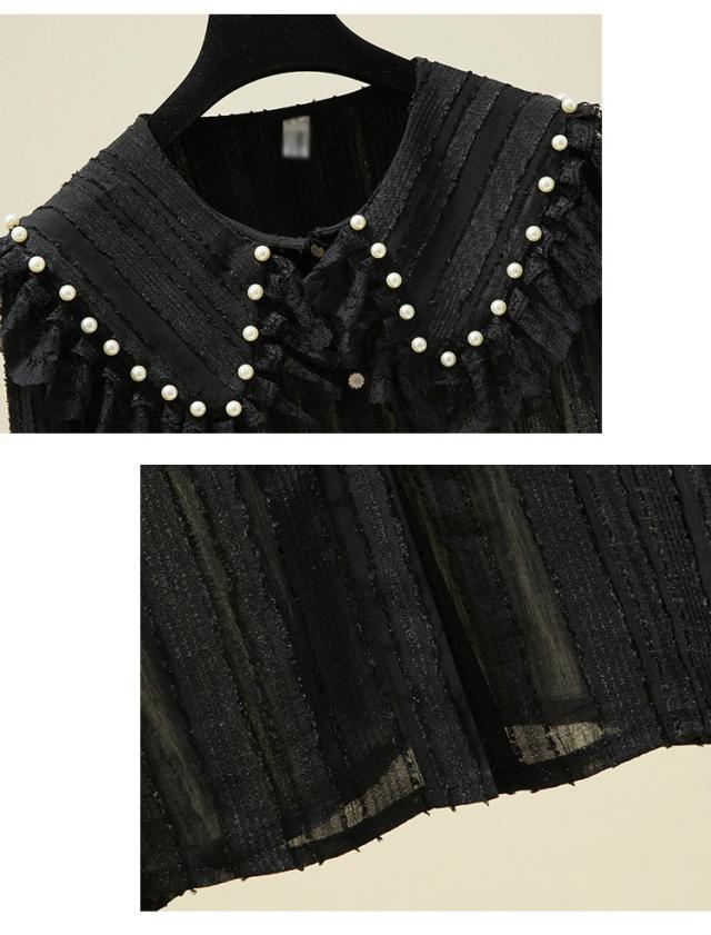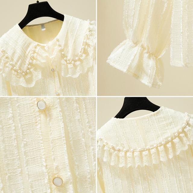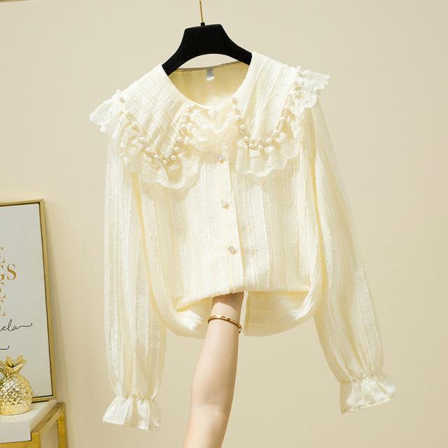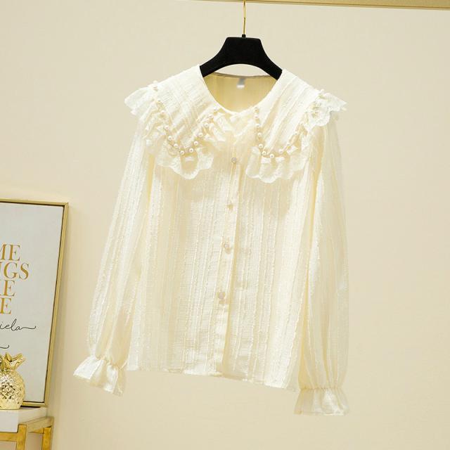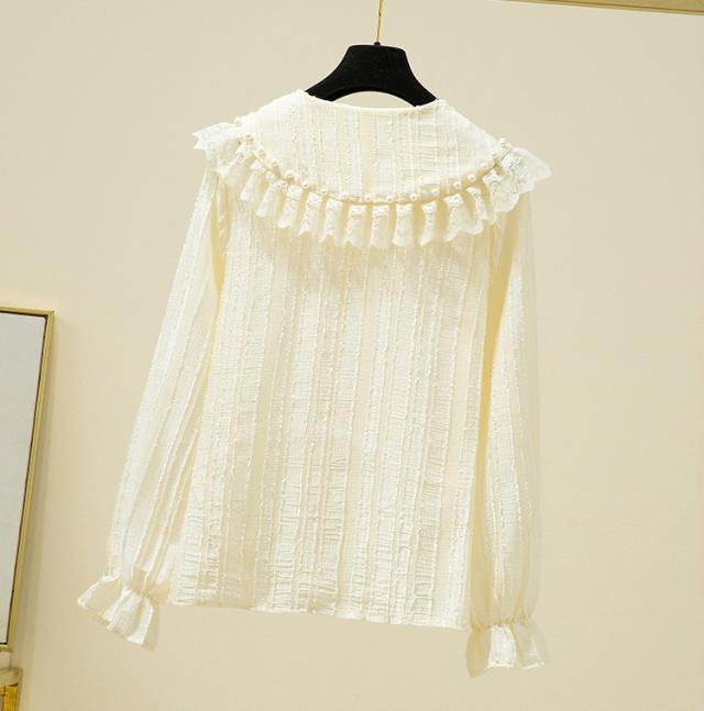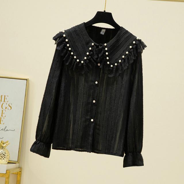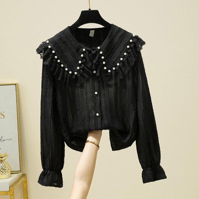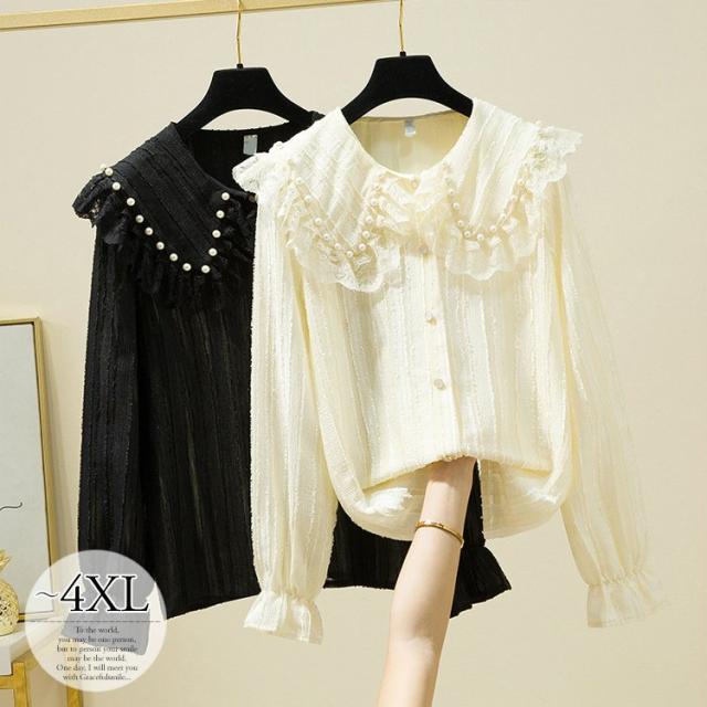 ブラウス レディース 長袖 フリル セーラーカラー 襟付き パール付き レース クラシカル 大人可愛い ホワイト ブラック おしゃれ 休日 母親 イベント