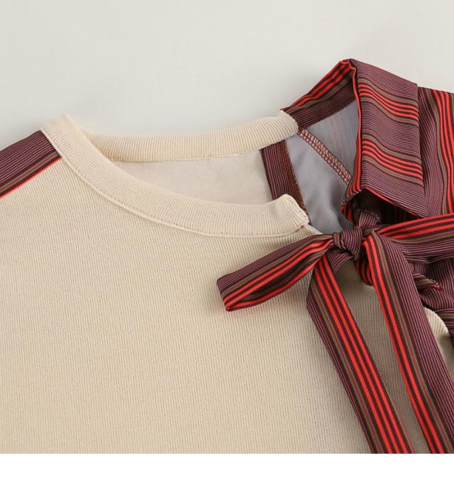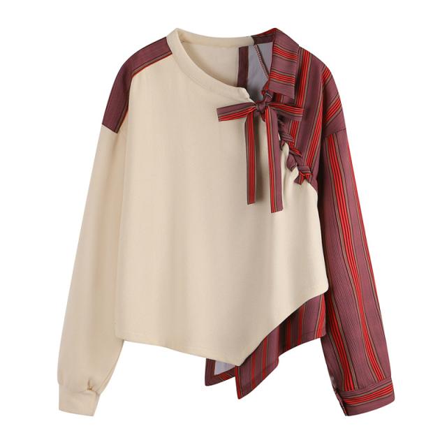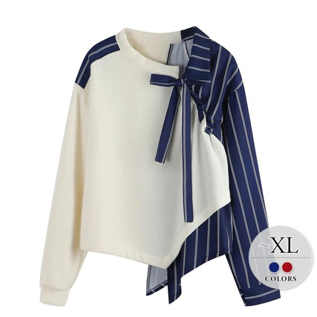 スウェット レディース 長袖 アシンメトリー ストライプ 柄物 リボン 大人可愛い 個性的 レッド ネイビー 女子会 モダン デート おしゃれ イベント清楚