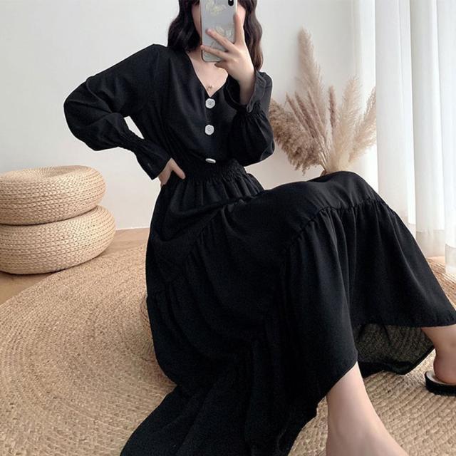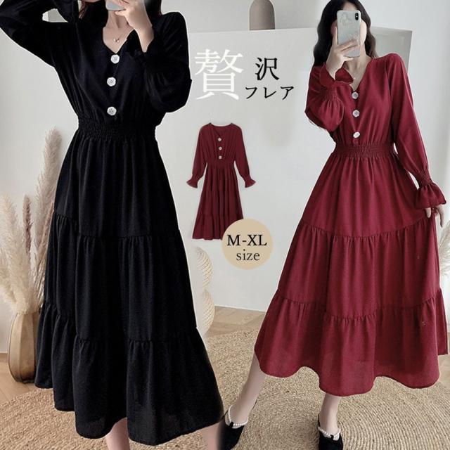 ドワンピース レディース Vネック 長袖 Aラインワンピース ウエストマーク着やせ おしゃれ ミモレ丈ワンピ 大人かわいい【ネコポス可】