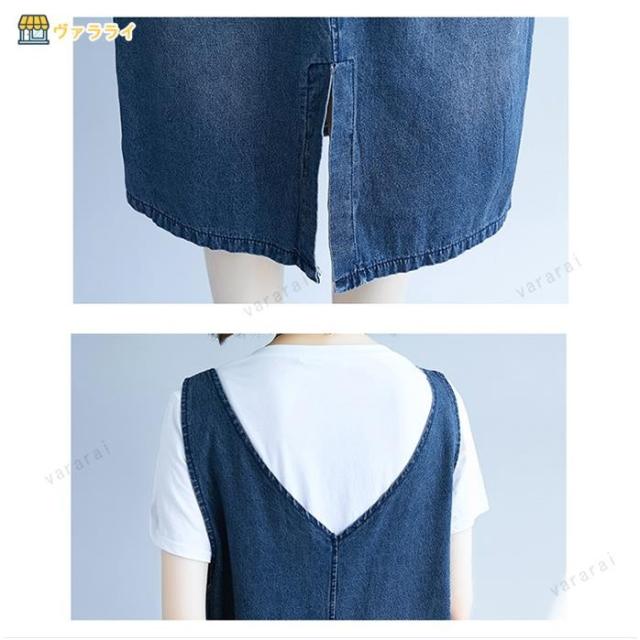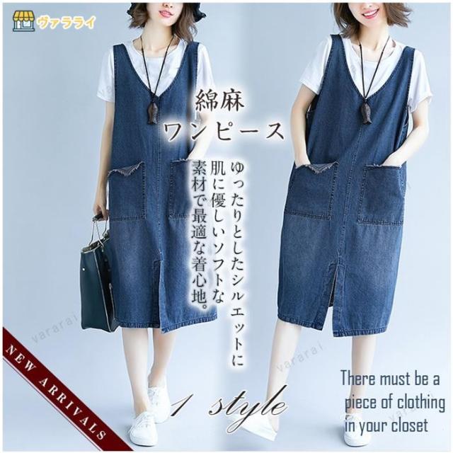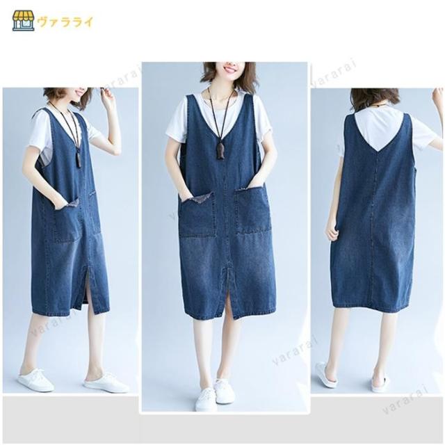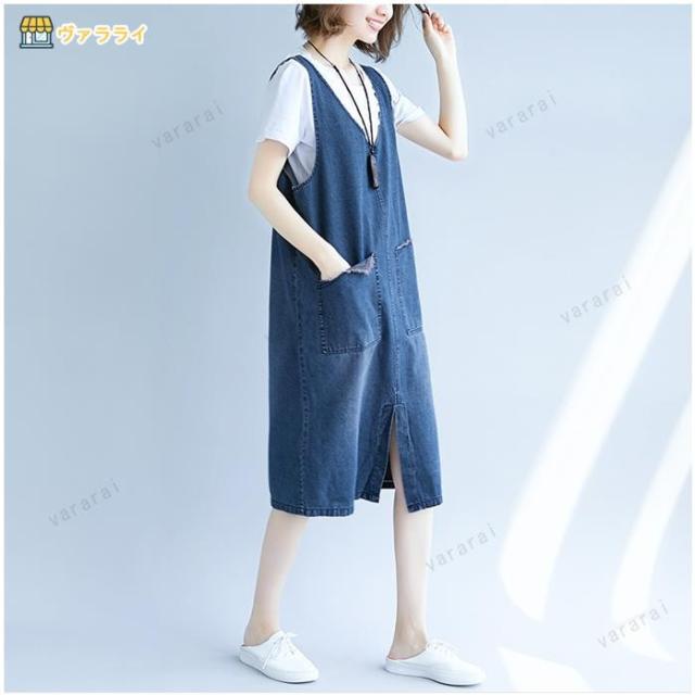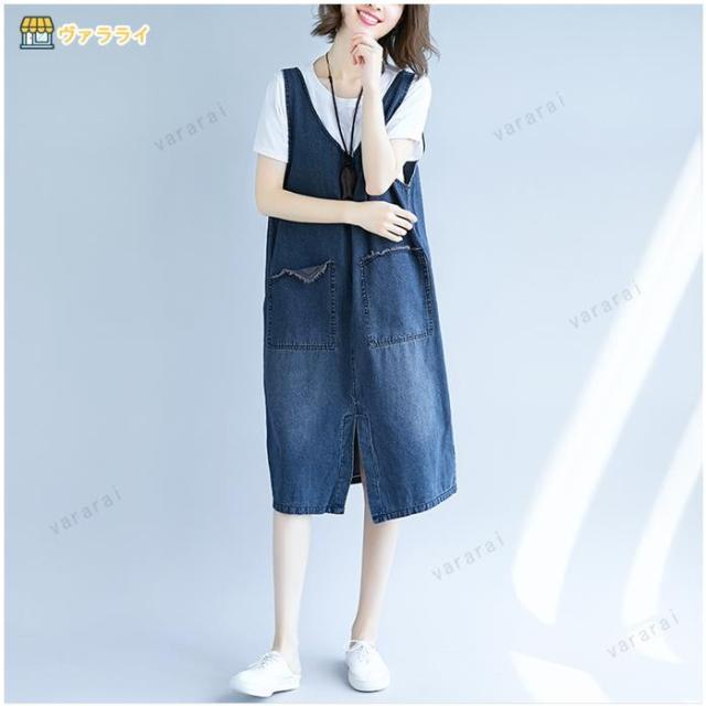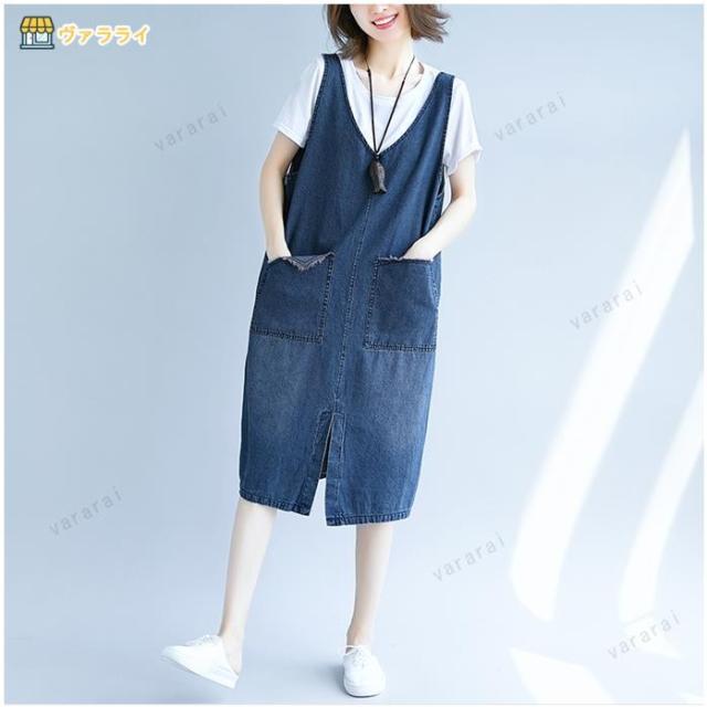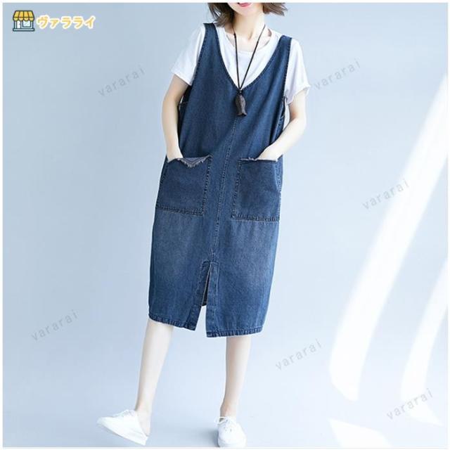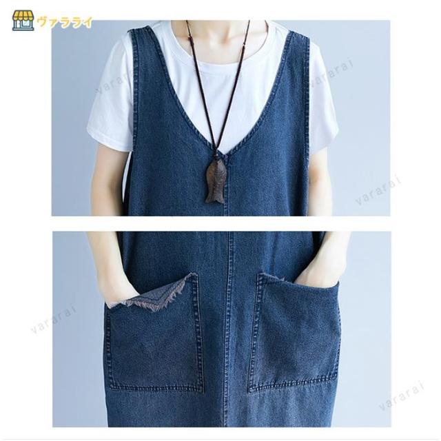 vネック デニム サスペンダースカート ゆったり 外ポケット付き レディース つりスカート 吸汗 コットン 通気