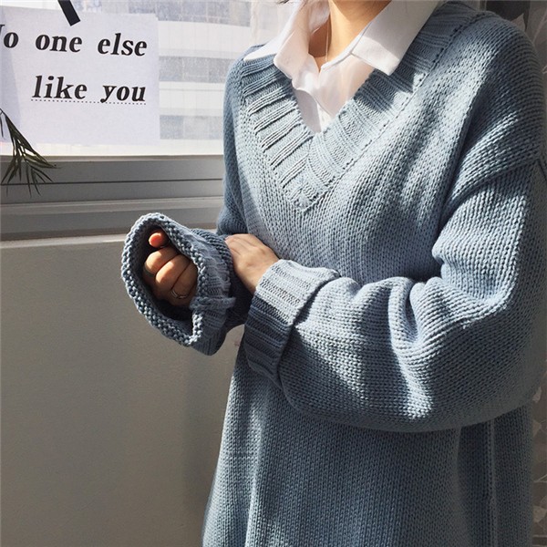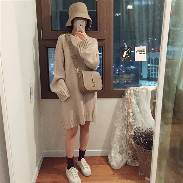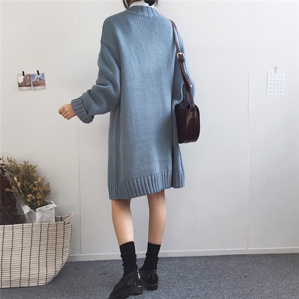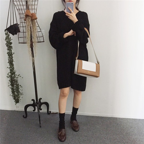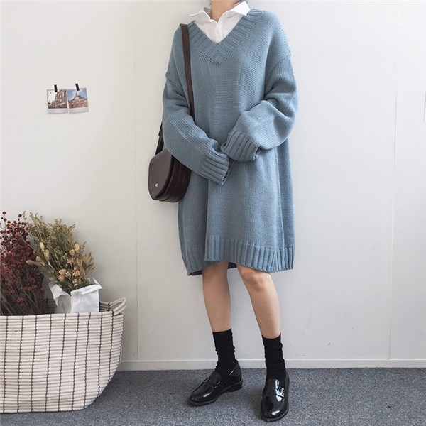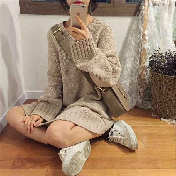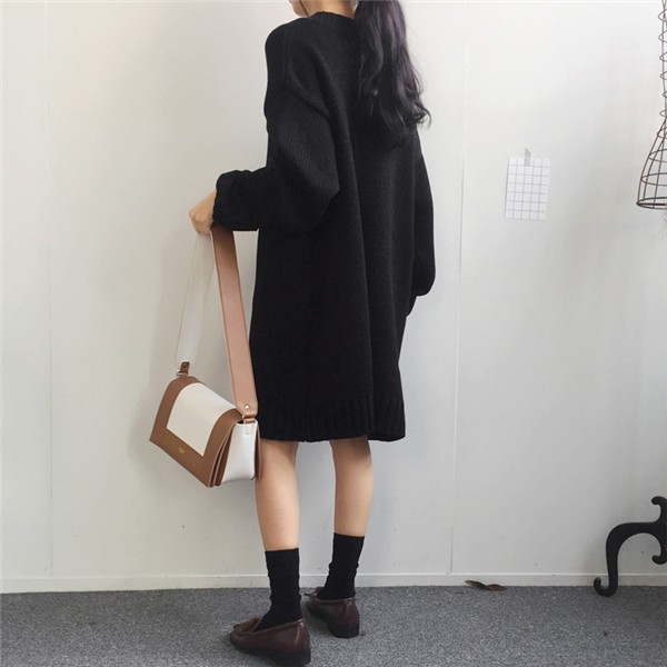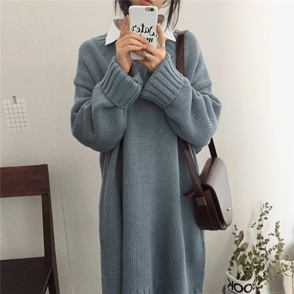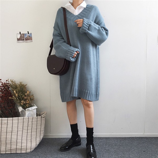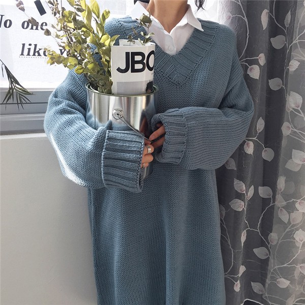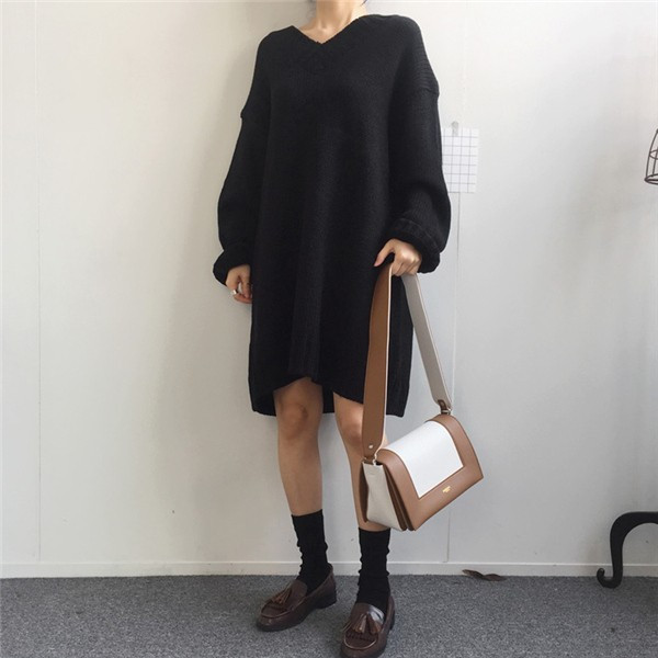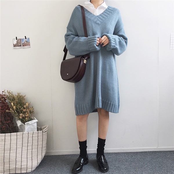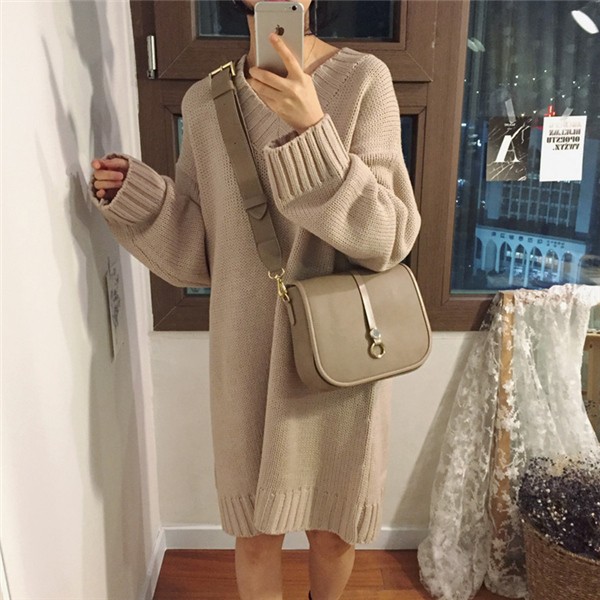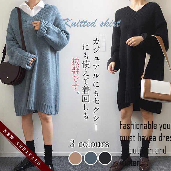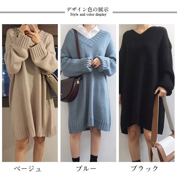 レディース ニットワンピース ロング丈 Vネック ゆったり クラシック 学院風 長袖 無地 カジュアルドレス 通勤 着痩せ 秋冬 大人気