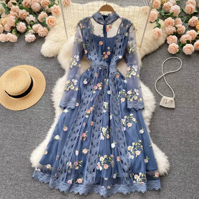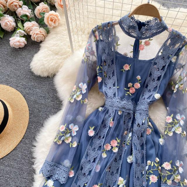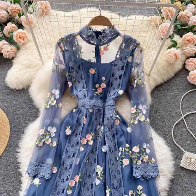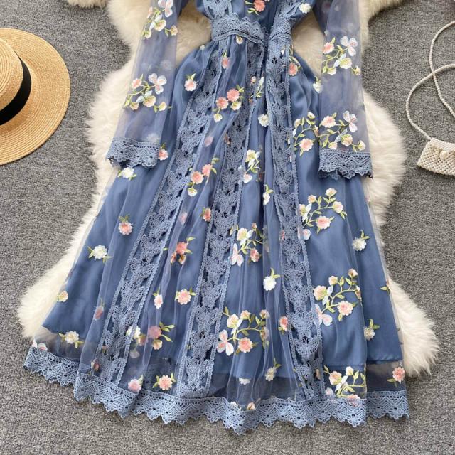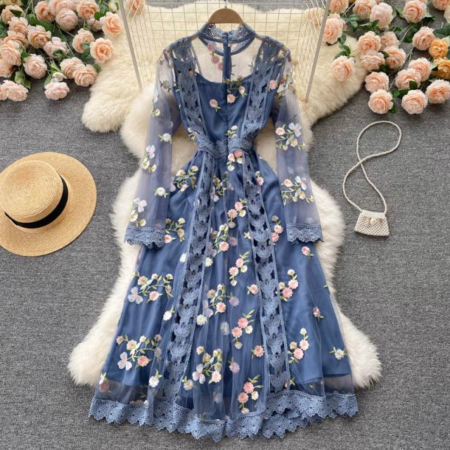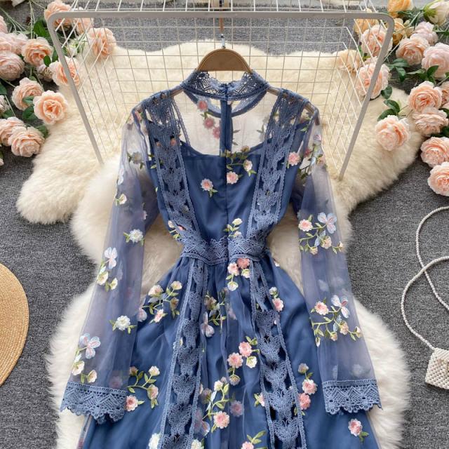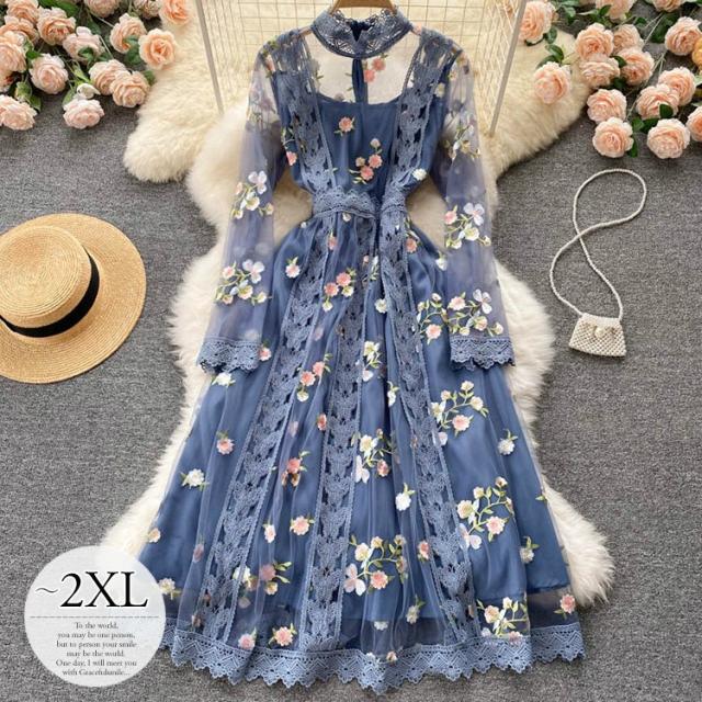 ワンピース スカート レディース レディースファッション 長袖 シースルー レース 肌見せ 花柄 ブルーレディース イベント清楚 リラックス 繊細