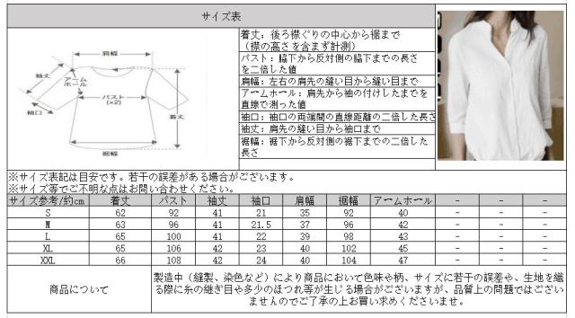 | サイズについての説明 | サイズ: S: 着丈61cm バスト92cm 肩幅35cm 袖丈41cm袖口21cm M: 着丈62cm バスト96cm 肩幅37cm 袖丈41cm 袖口21.5cm L: 着丈63cm バスト100cm 肩幅39cm 袖丈41cm 袖口22cm XL: 着丈64cm バスト106cm 肩幅40cm 袖丈42cm 袖口23cm XXL:着丈65cm バスト108cm 肩幅40cm 袖丈42cm 袖口24cm |