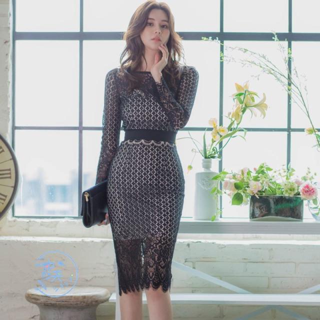 タイトワンピース セクシーワンピース ワンピースレディース30代40代 長袖ワンピース 膝丈ワンピース 着痩せ 透け感 スリム レース ラウンドネック 二次会