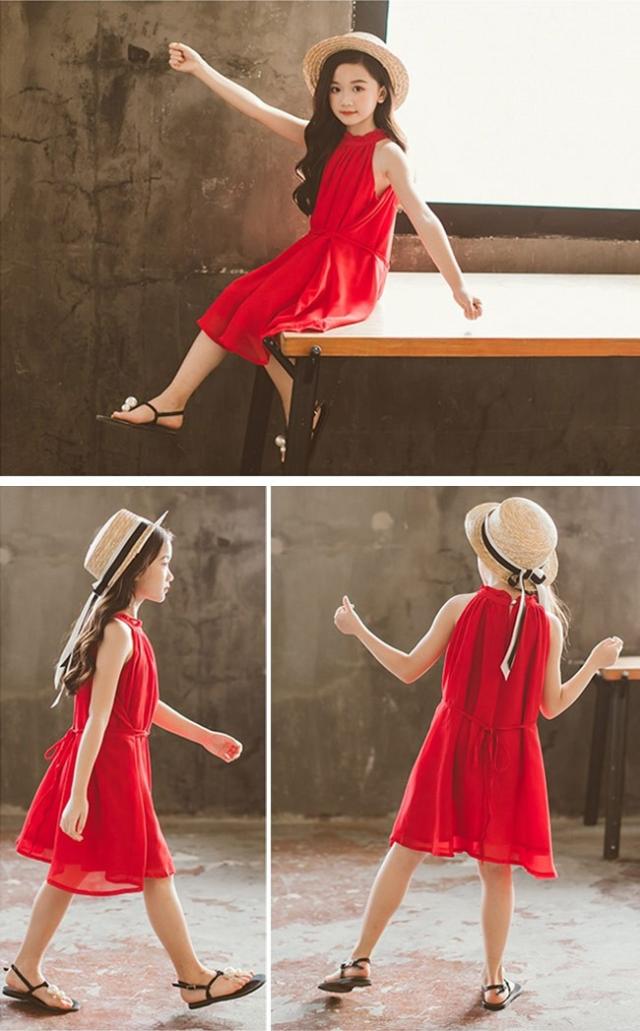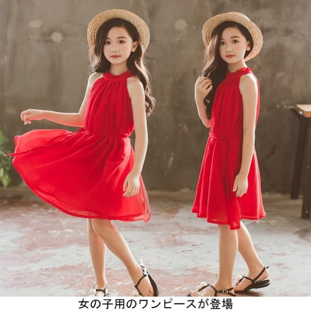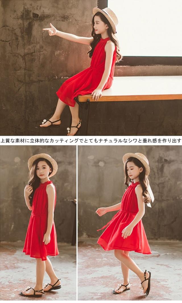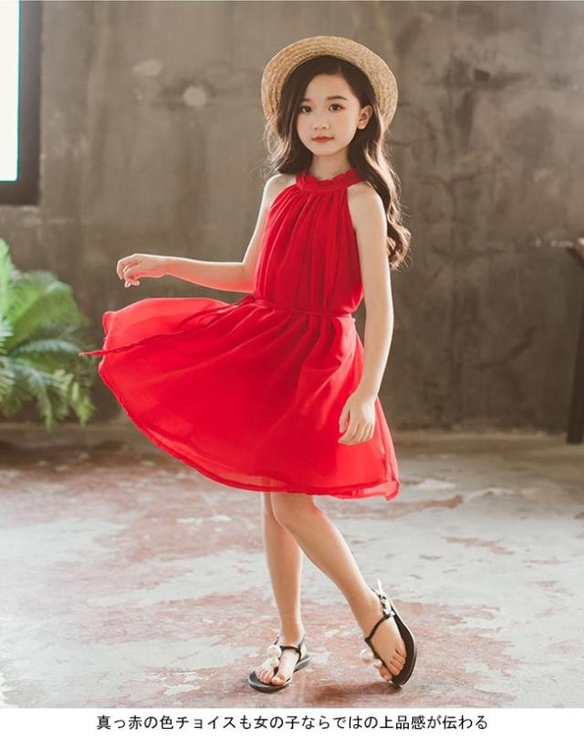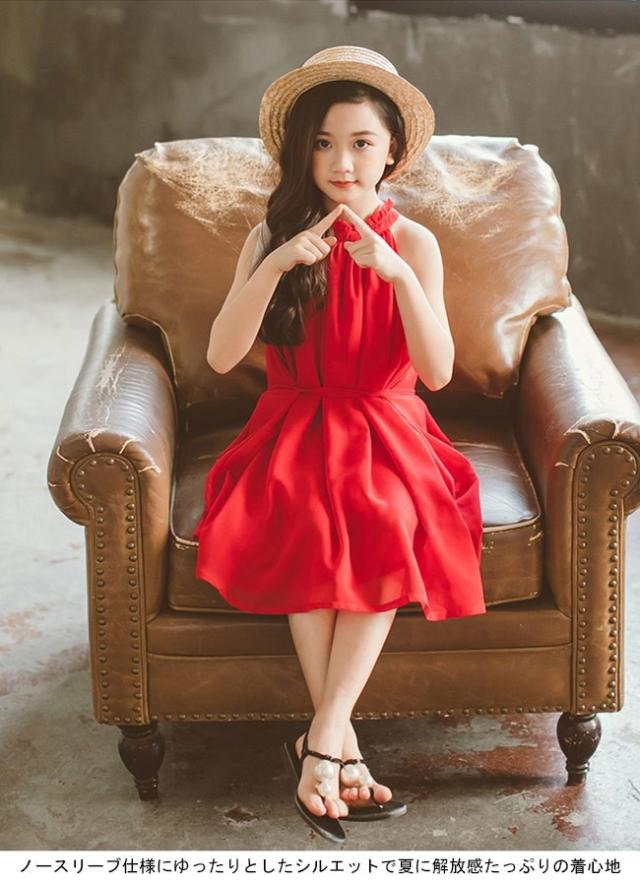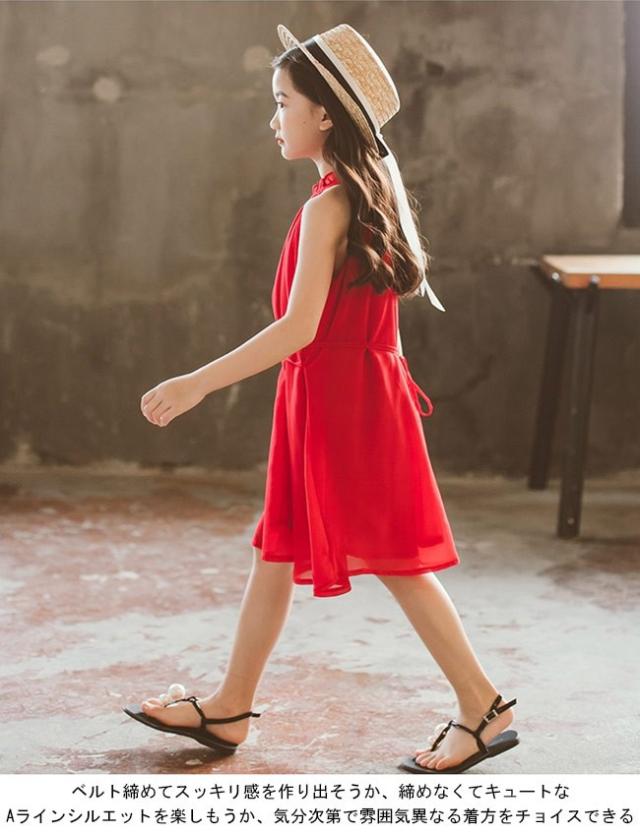 女児 ワンピース ホルターネック ノースリーブ 子供服 膝丈ワンピース ジュニア 夏物 薄手 ミディアム丈ワンピース キッズ服 レトロ