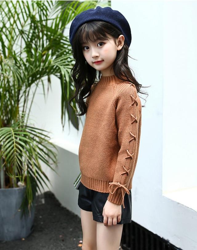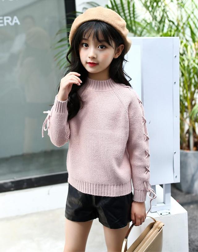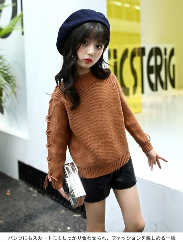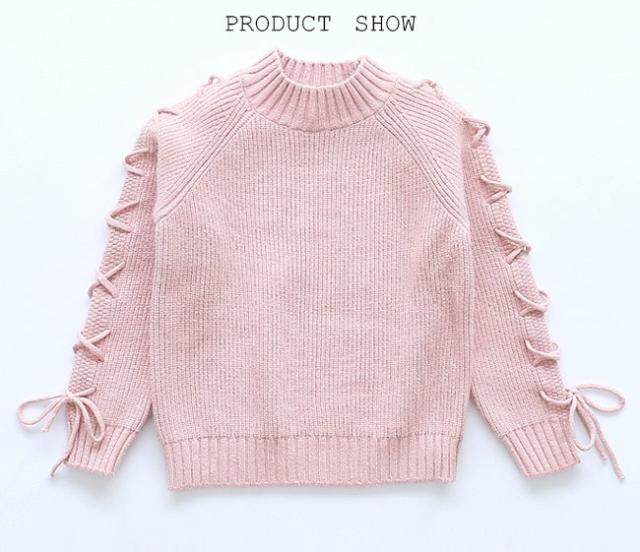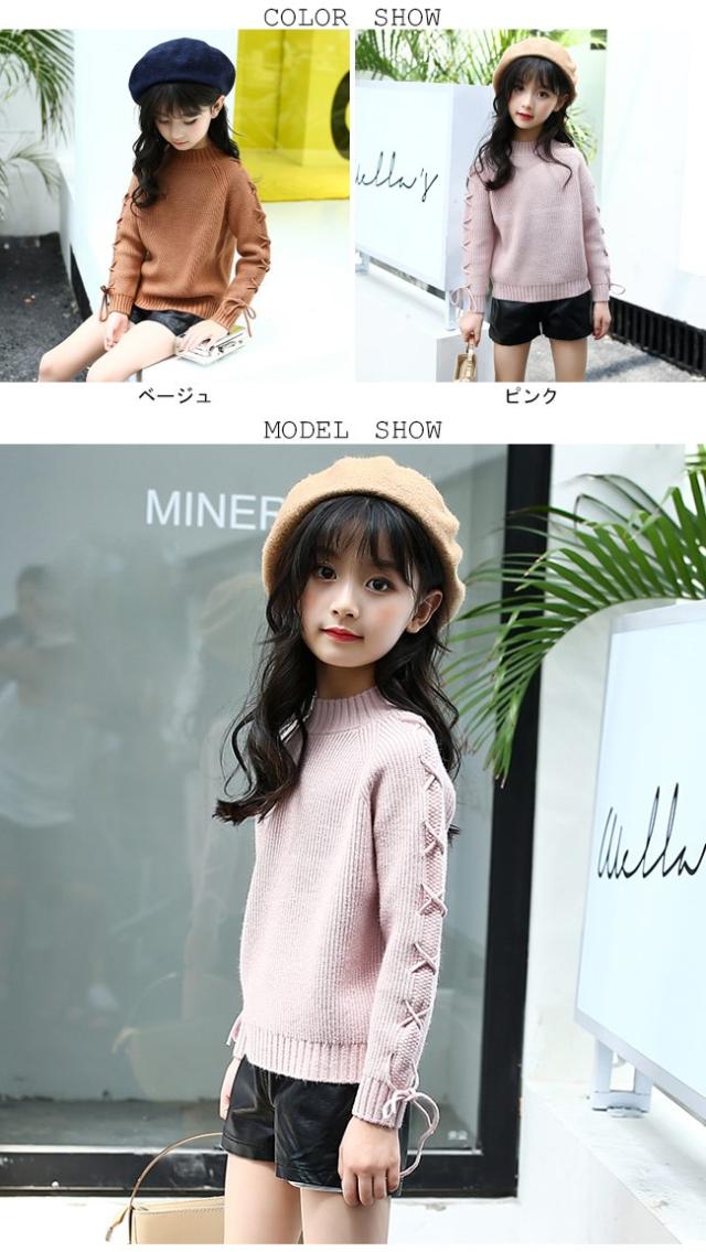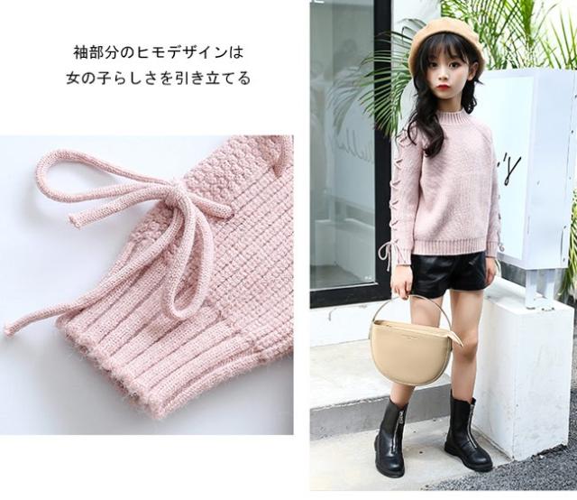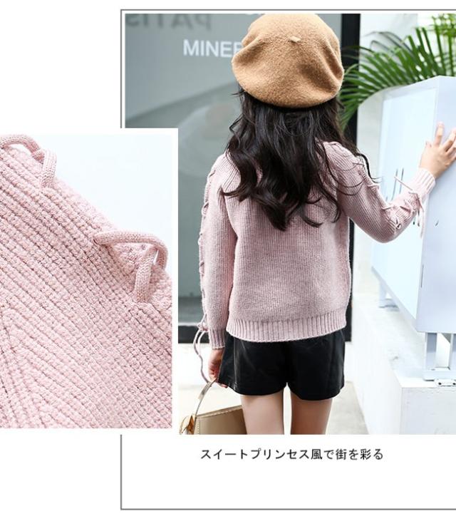 ニットセーター ヒモ 紐 キッズ 女の子 女児 リブ仕様 子供用品 トップス 秋冬物 長袖 ラウンドネック 丸首 キュート スイート プリンセス