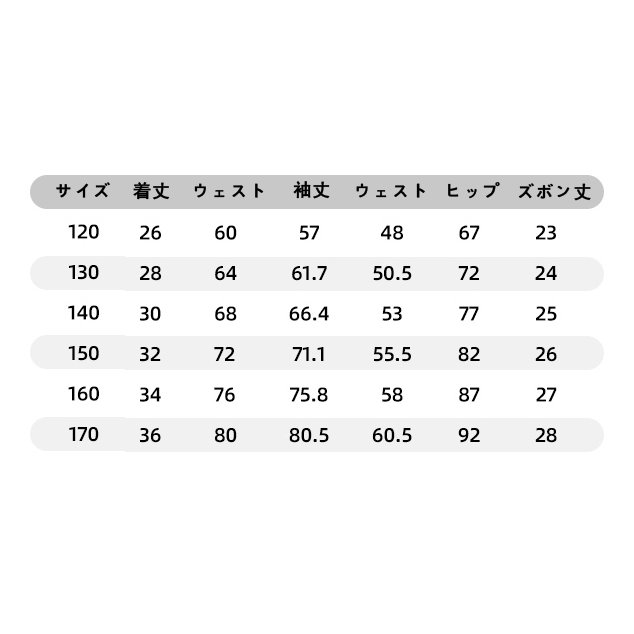 | サイズについての説明 | 【サイズ】 【120】参考身長110-120cm 【130】参考身長120-130cm 【140】参考身長130-140cm 【150】参考身長140-150cm 【160】参考身長150-160cm 【170】参考身長160-170cm 【180】参考身長170-180cm |